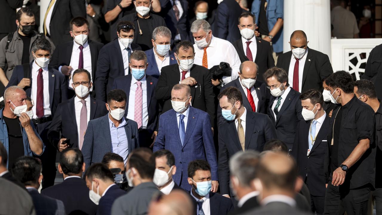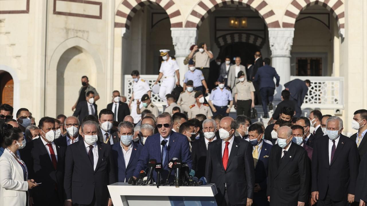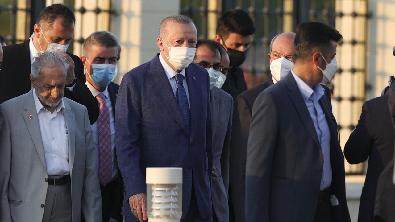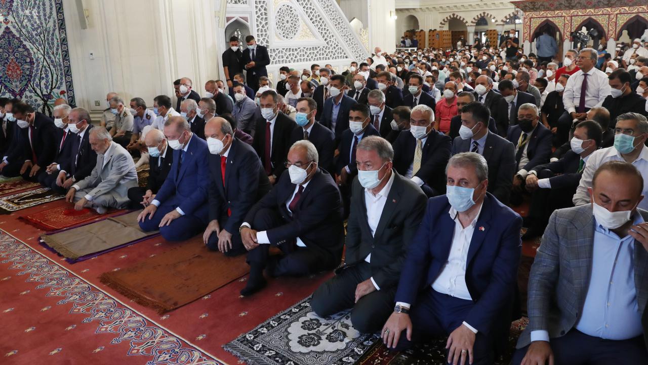 Türkiye Cumhurbaşkanı Recep Tayyip Erdoğan, KKTC Cumhurbaşkanı Ersin Tatar ile birlikte Kurban Bayramı namazını kılmak üzere Lefkoşa`daki Hala Sultan Camii`ne geldi.