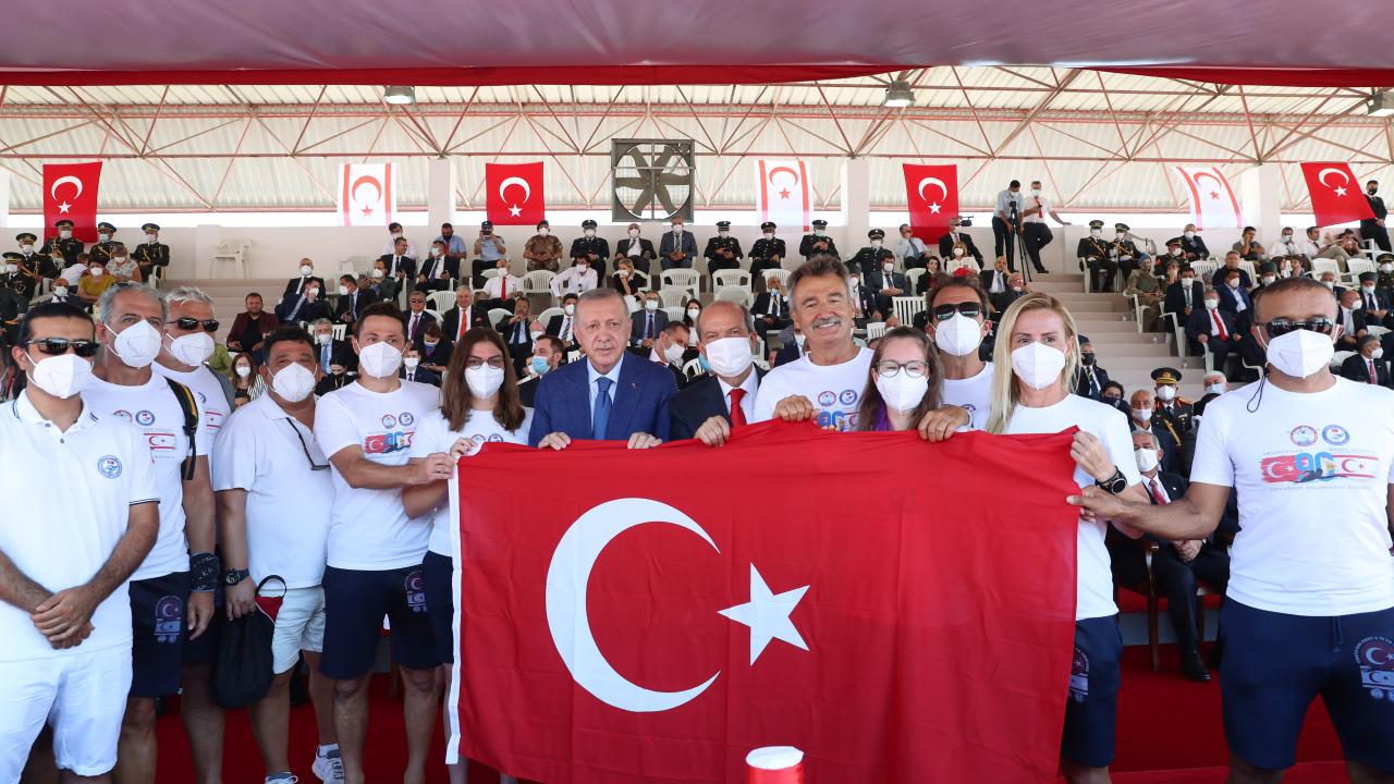 Türkiye Cumhurbaşkanı Recep Tayyip Erdoğan, Mersin`den Kıbrıs`a yüzerek gelen sporcularla bir araya geldi.