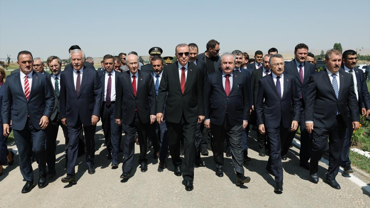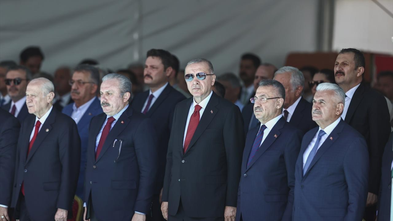 Tören sonrası Erdoğan, Bahçeli ve Destici`nin ellerini havaya kaldırarak vatandaşları selamladı.