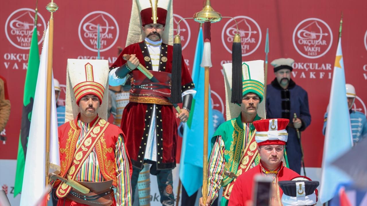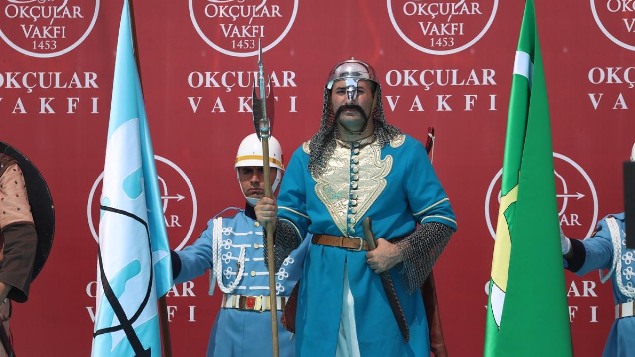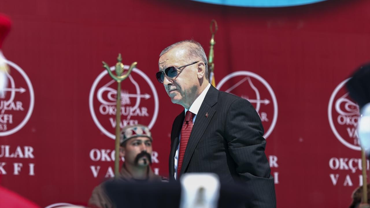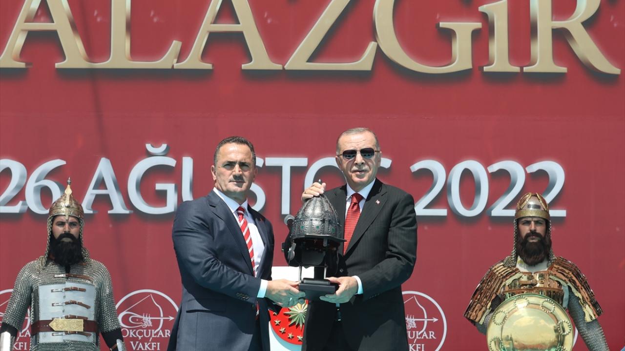 Cumhurbaşkanı Erdoğan`ın konuşmasının ardından Okçular Vakfı Mütevelli Heyeti Başkanı Haydar Ali Yıldız, Erdoğan`a, MHP Genel Başkanı Devlet Bahçeli`ye ve BBP Genel Başkanı Mustafa Destici`ye günün anısına hediye takdim etti.