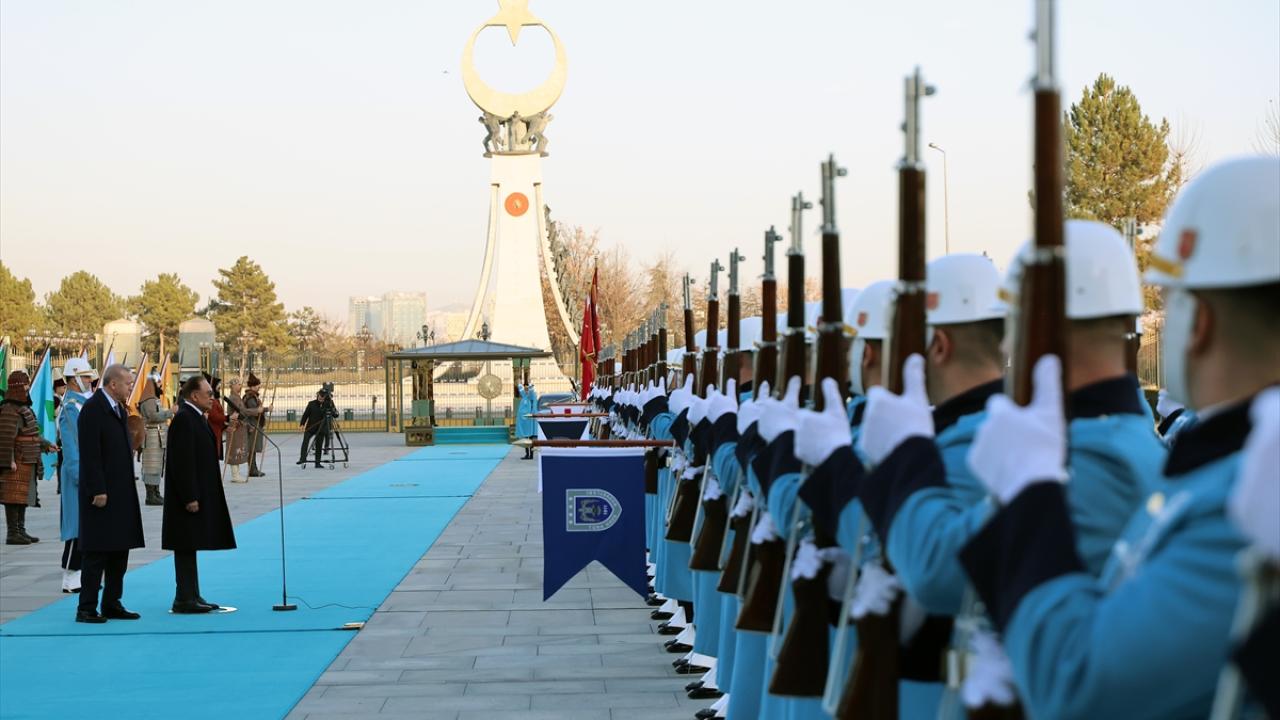 Cumhurbaşkanı Erdoğan, Enver`i külliyenin ana giriş kapısında karşıladı. Erdoğan ve Enver`in tören alanındaki yerlerini almasının ardından, iki ülkenin milli marşları çalındı.