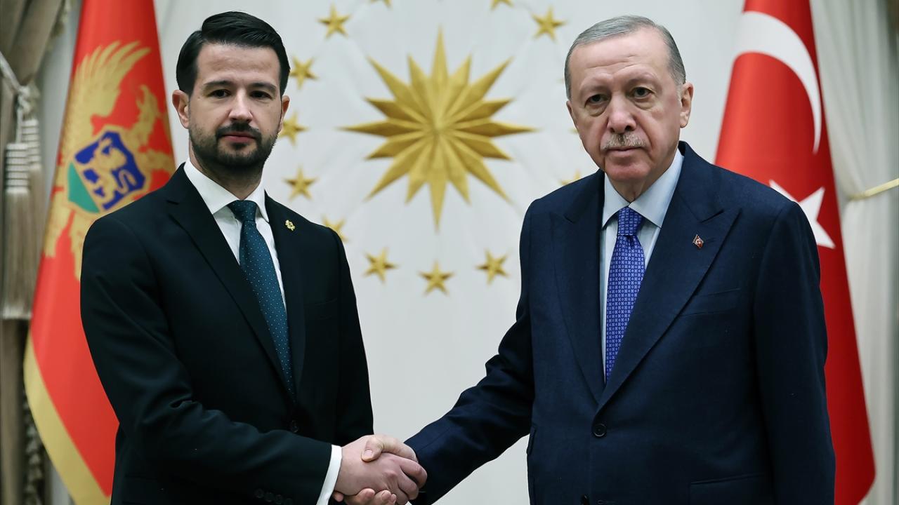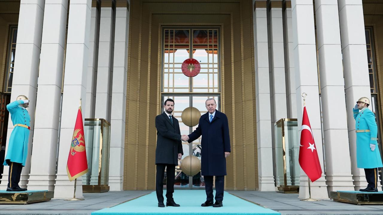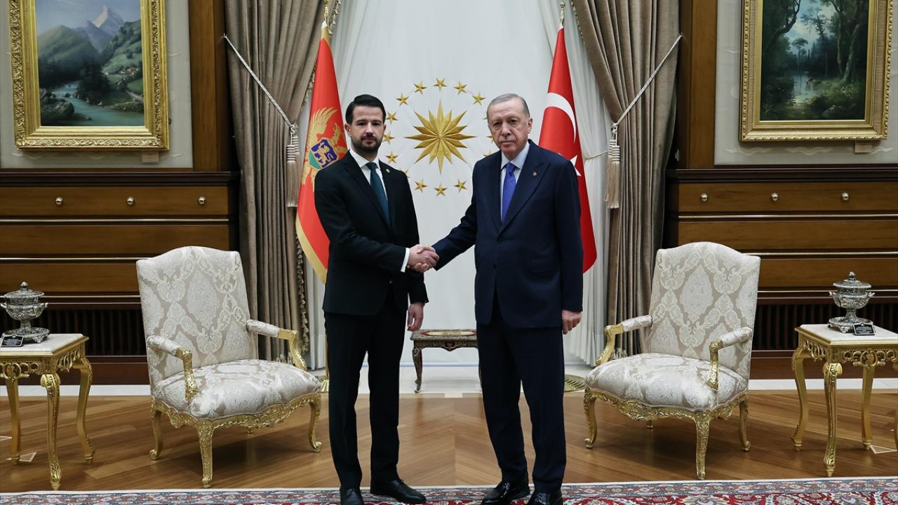 Erdoğan ve Milatoviç, merdivenlerde Türkiye ve Karadağ bayrakları önünde tokalaşarak basın mensuplarına poz verdi.