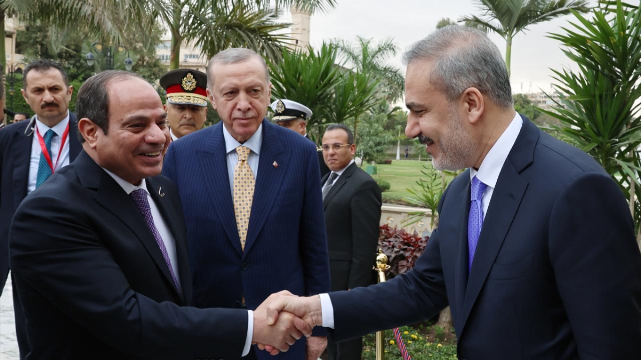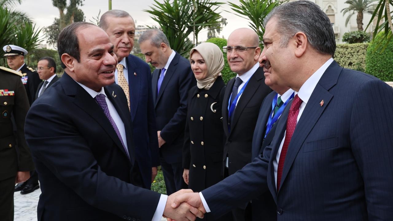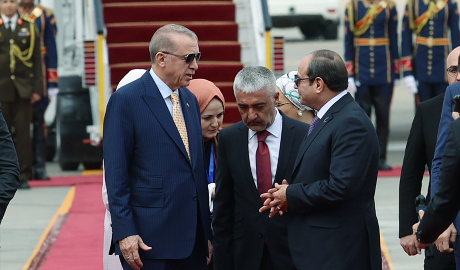 Mevkidaşı Sisi ile tören kıtasını denetleyen Erdoğan, askerleri selamladı. İki lider tokalaşarak basın mensuplarına poz verdi.