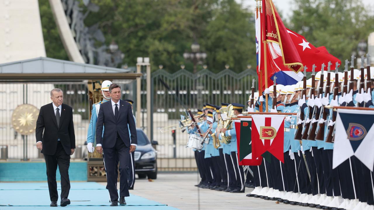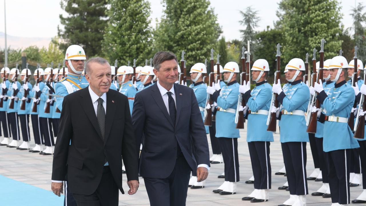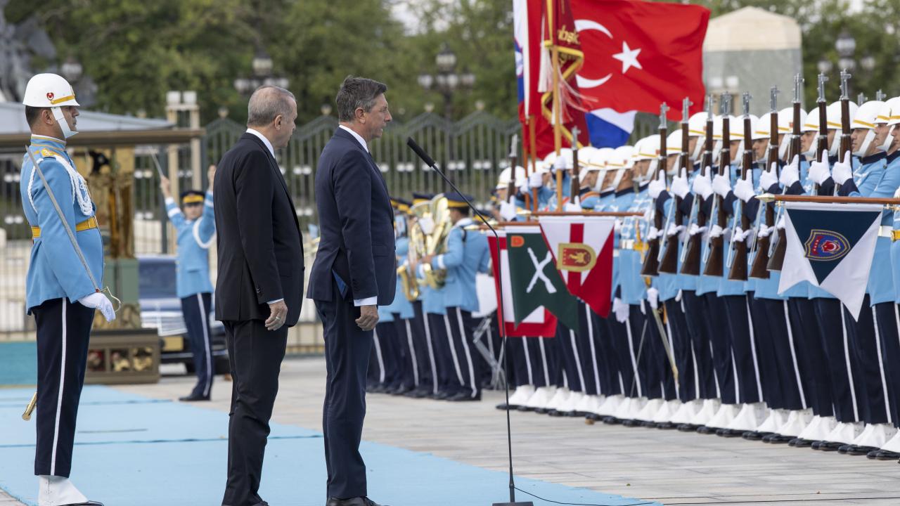 Erdoğan ve Pahor`un tören alanındaki yerlerini almalarının ardından, 21 pare top atışı eşliğinde iki ülke milli marşları çalındı. Borut Pahor, Muhafız Alayı Tören Kıtası`nı, Türkçe "Merhaba asker" diyerek selamladı.