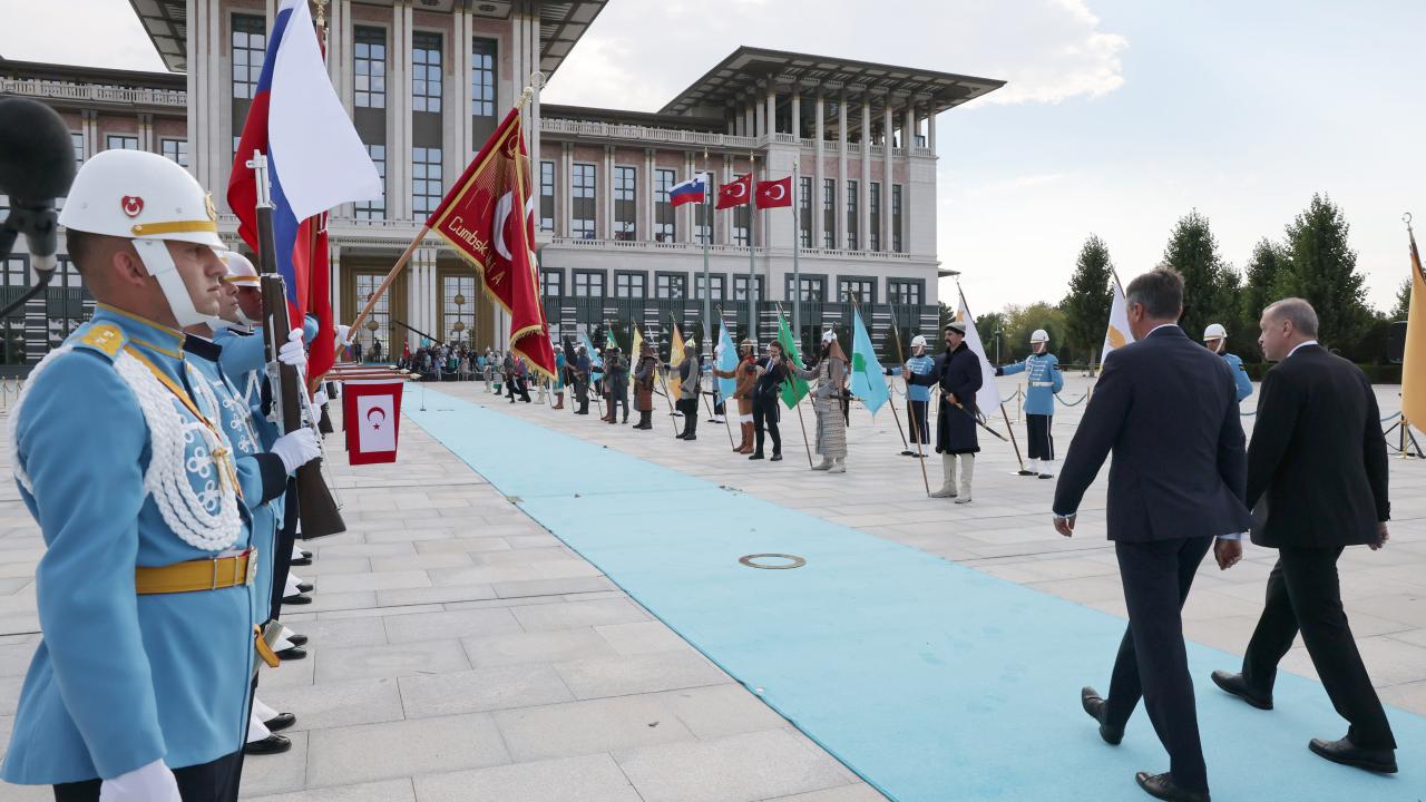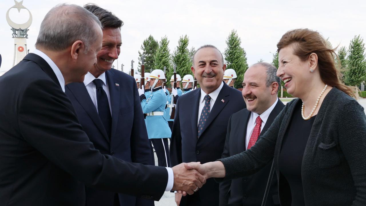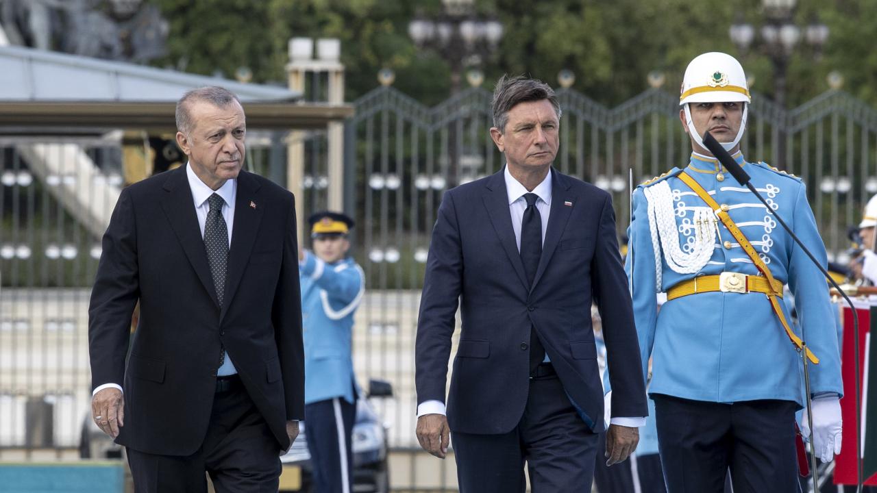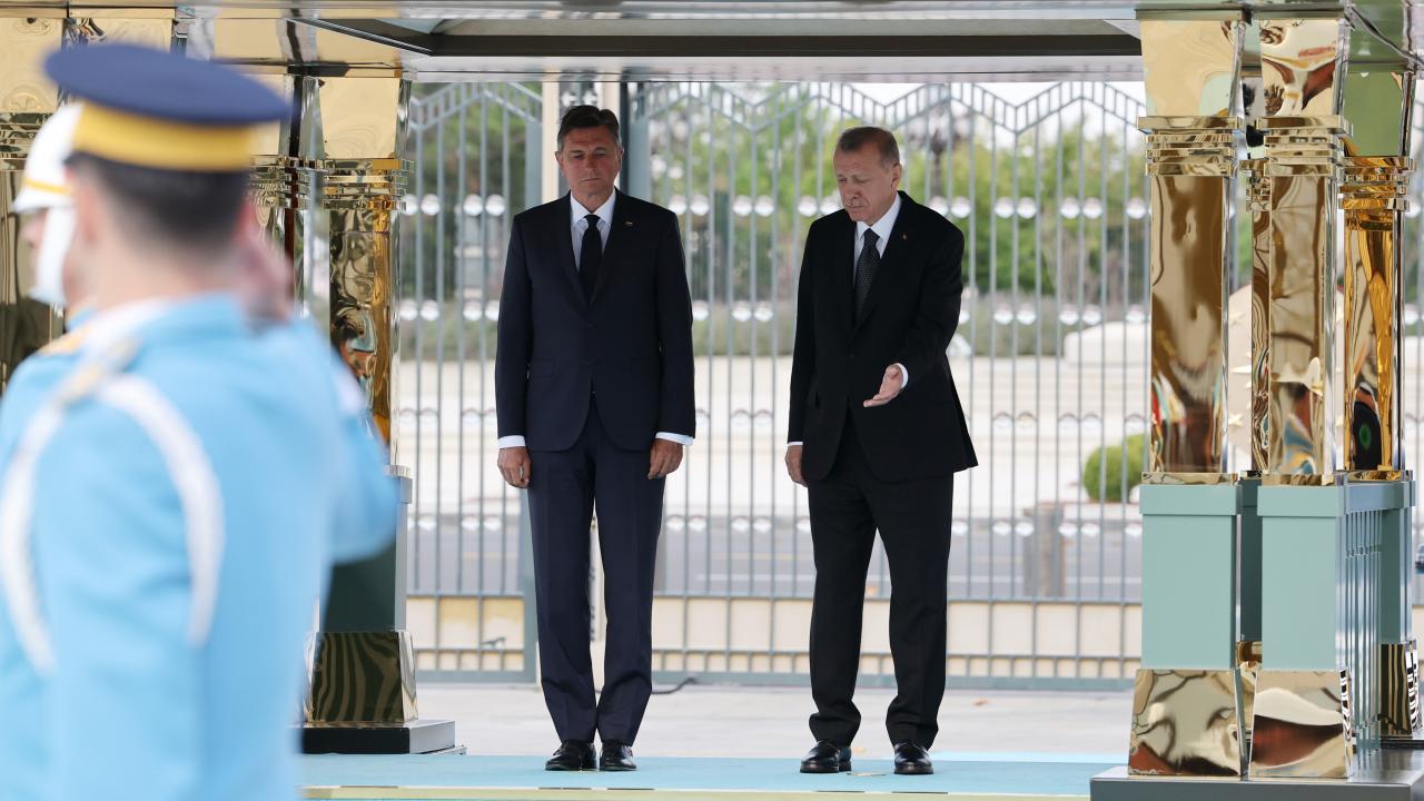 Erdoğan ve Pahor`un tören alanındaki yerlerini almalarının ardından, 21 pare top atışı eşliğinde iki ülke milli marşları çalındı. Borut Pahor, Muhafız Alayı Tören Kıtası`nı, Türkçe "Merhaba asker" diyerek selamladı.