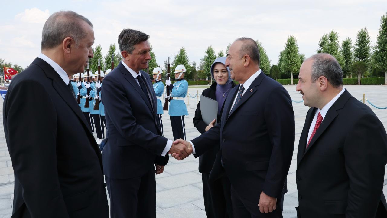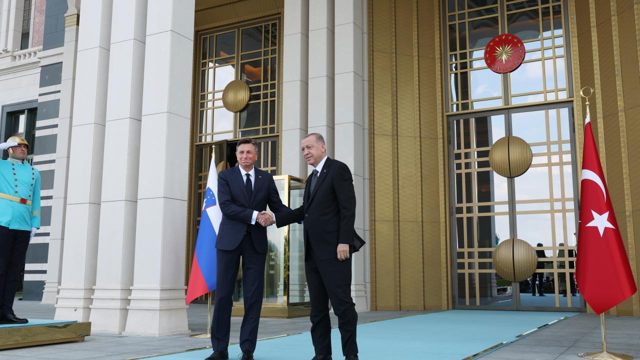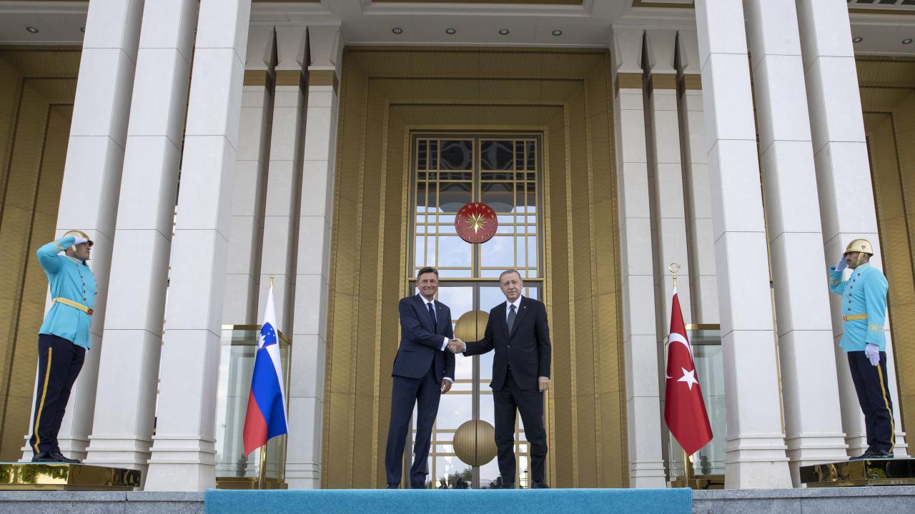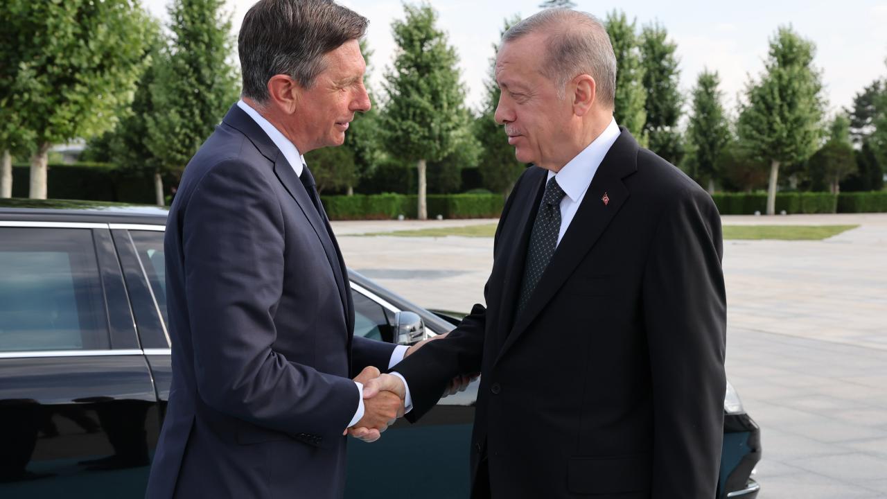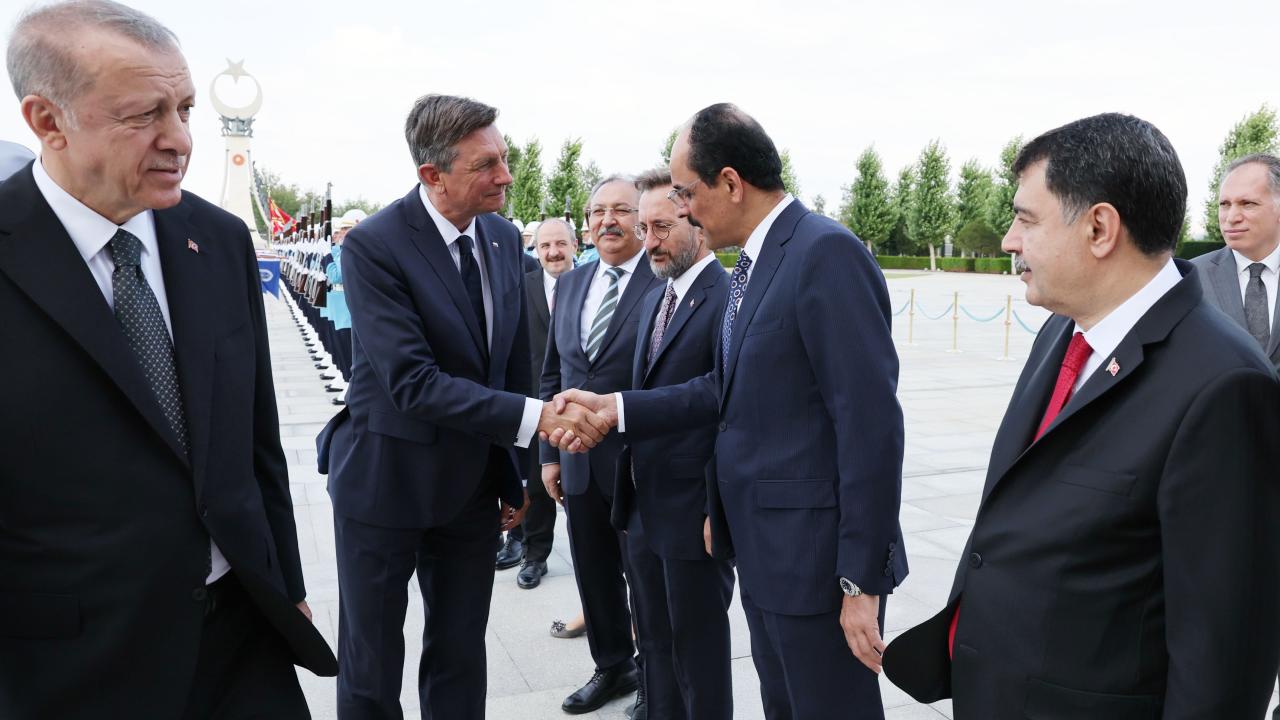Cumhurbaşkanı Erdoğan, Pahor`u Cumhurbaşkanlığı Külliyesi`nin ana giriş kapısında karşıladı.