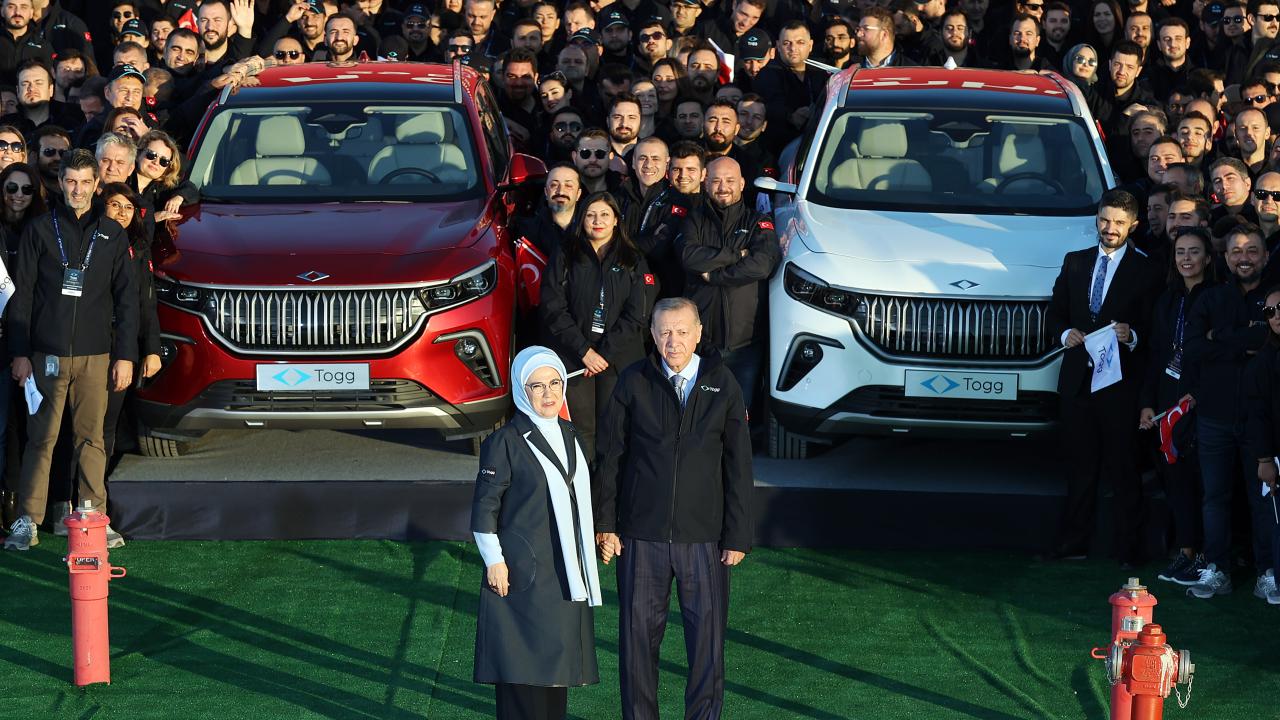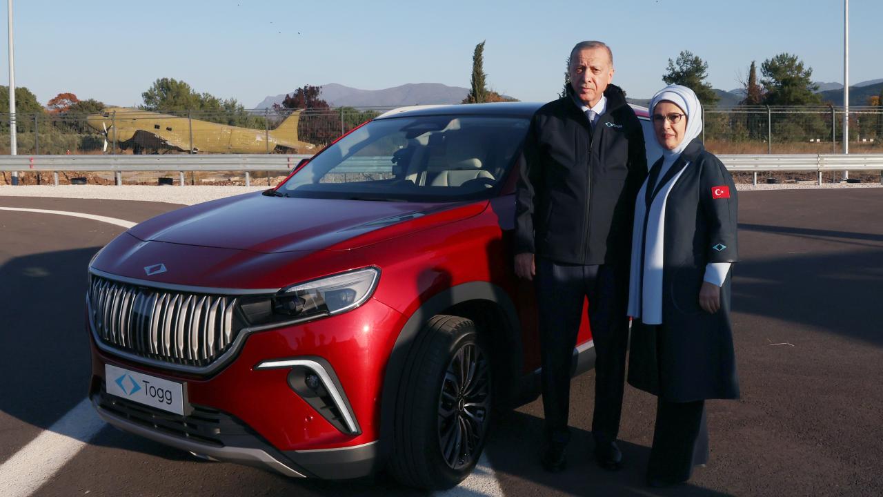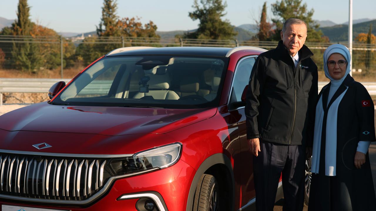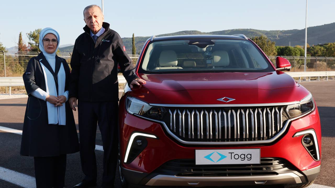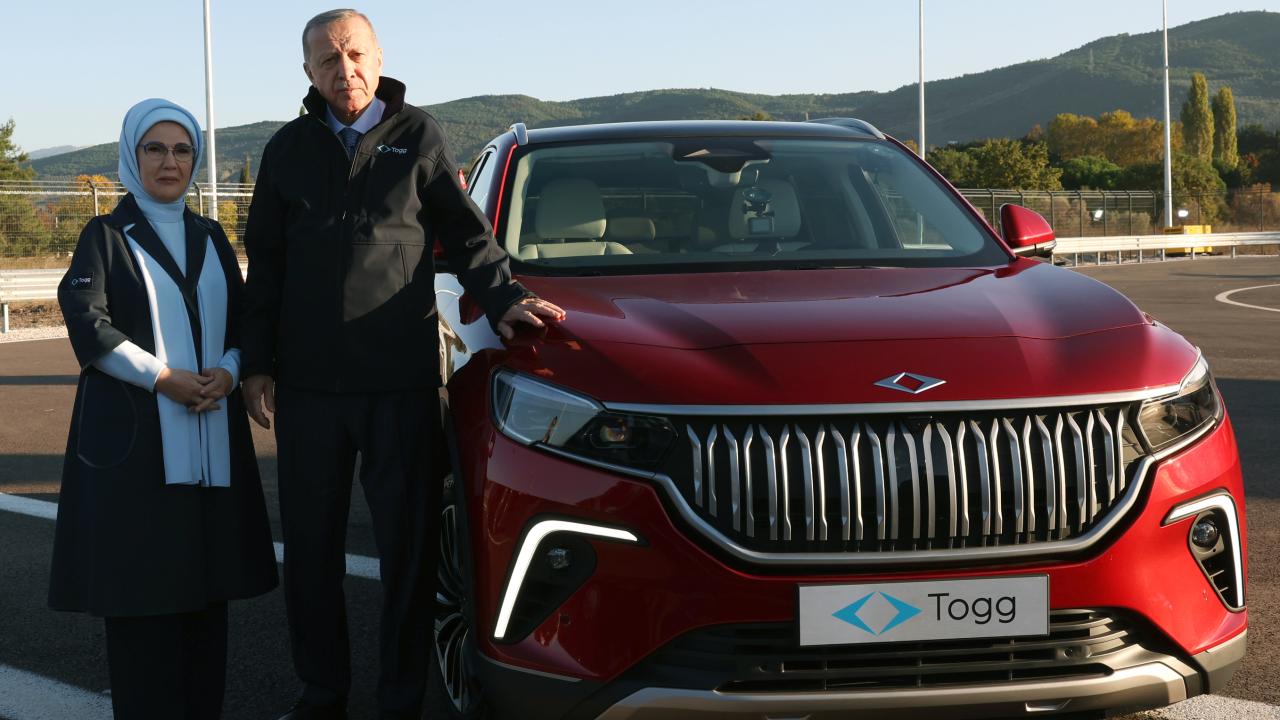 Togg logolu montlar giyen Cumhurbaşkanı Erdoğan ile eşi Emine Erdoğan, sonrasında Togg aracını test etti.