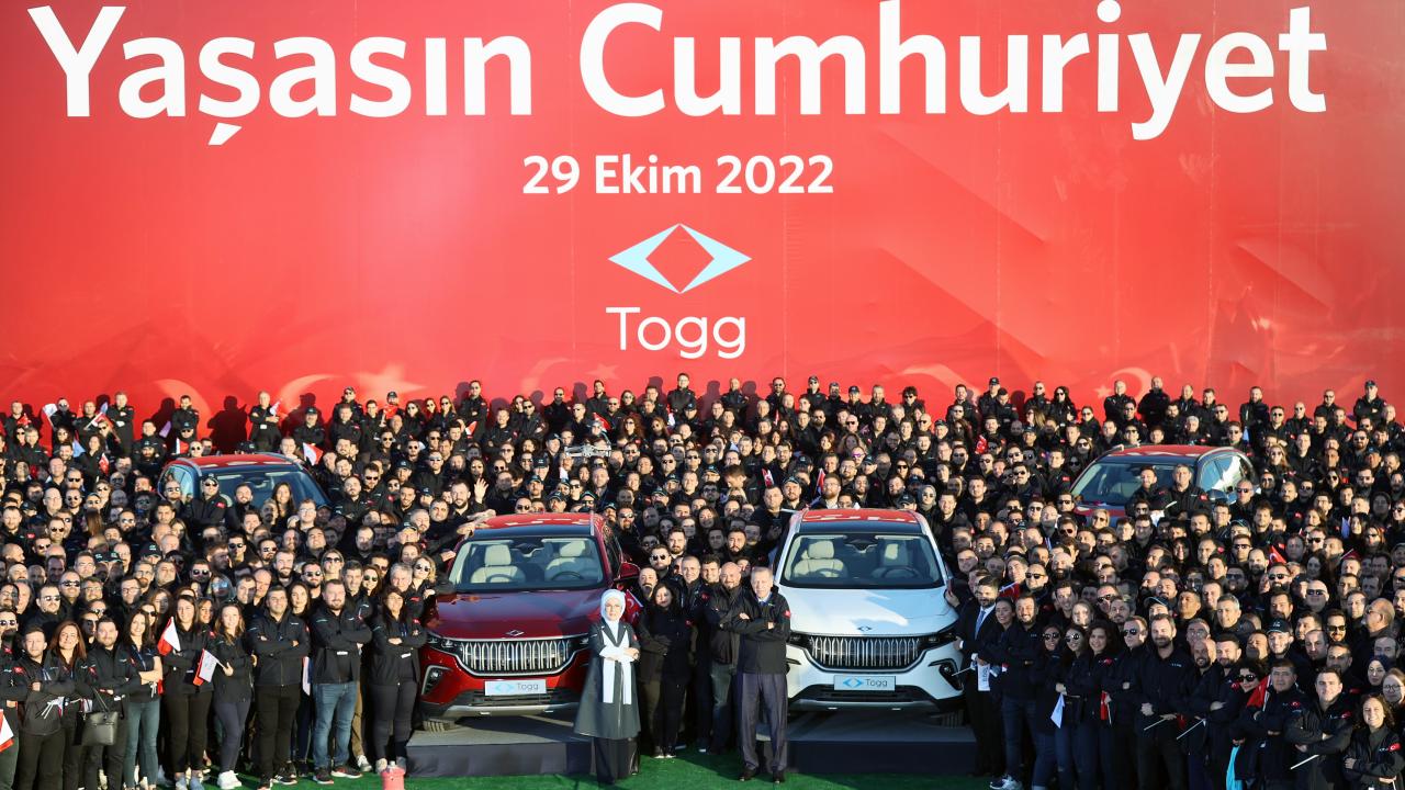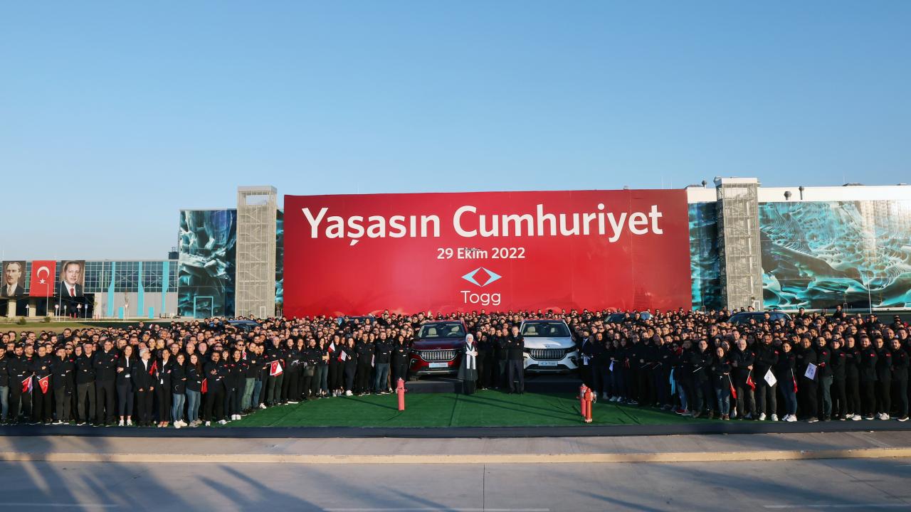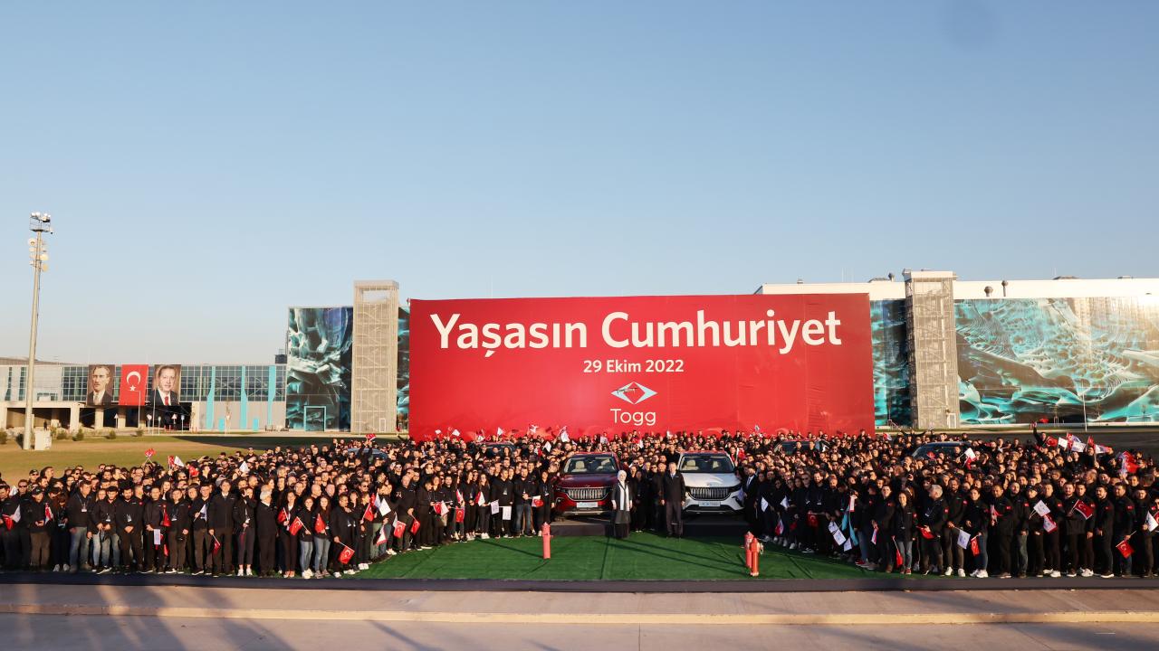 Hatıra fotoğrafı çekimi, "Yaşasın Cumhuriyet" yazılı zemin önünde gerçekleştirilirken, alanda farklı renklerde 6 Togg aracının varlığı dikkati çekti.