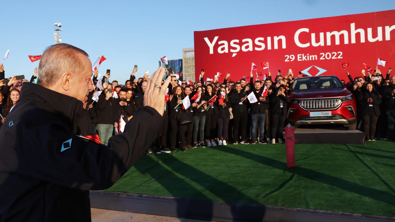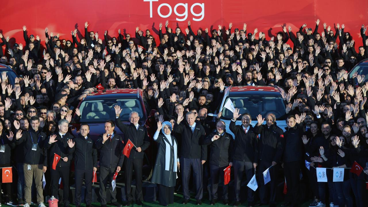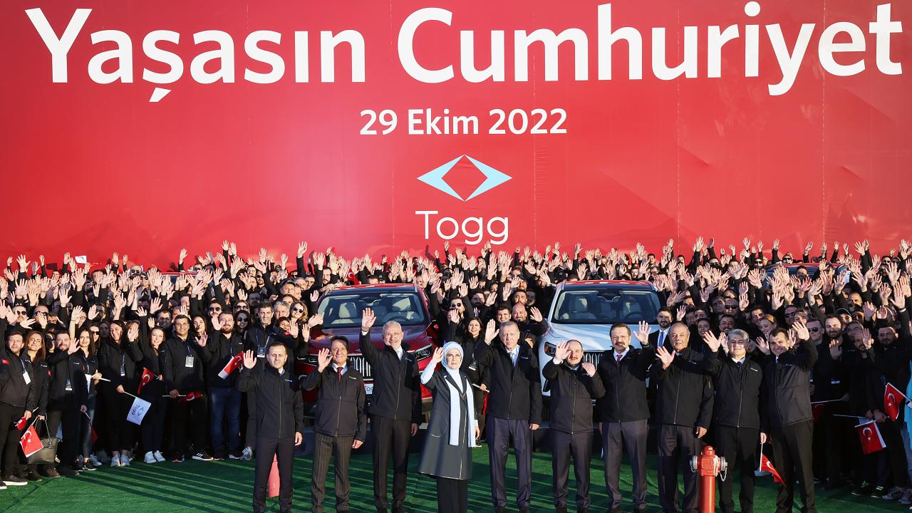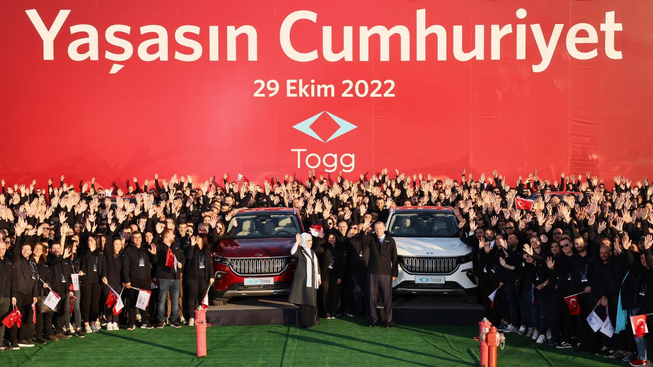 Hatıra fotoğrafı çekimi, "Yaşasın Cumhuriyet" yazılı zemin önünde gerçekleştirilirken, alanda farklı renklerde 6 Togg aracının varlığı dikkati çekti.
