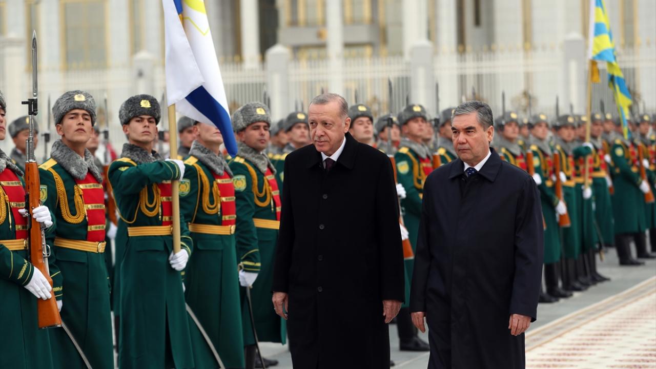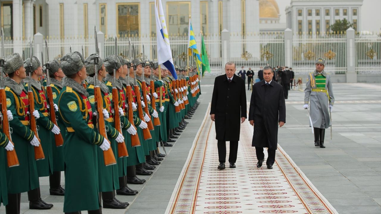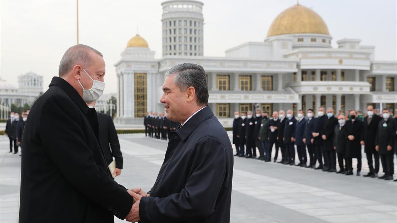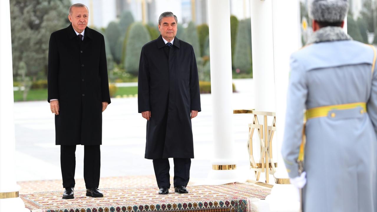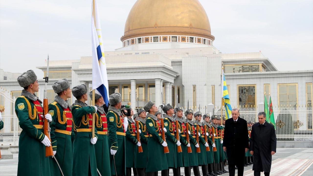 Cumhurbaşkanı Erdoğan, Türkmenistan Devlet Başkanı Gurbanguli Berdimuhammedov tarafından Oğuzhan Köşkü’nde resmi törenle karşılandı.