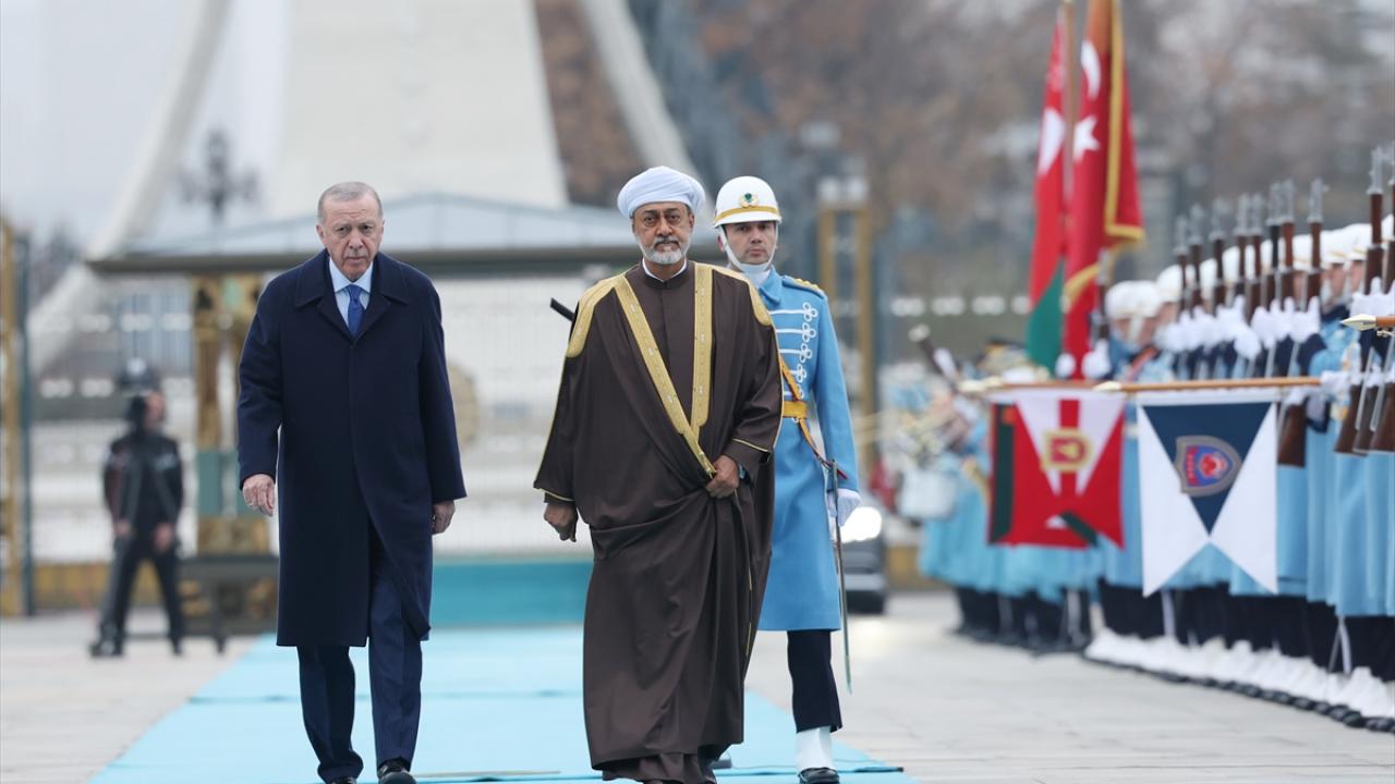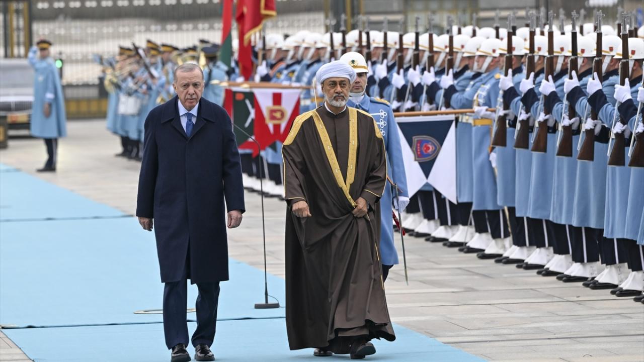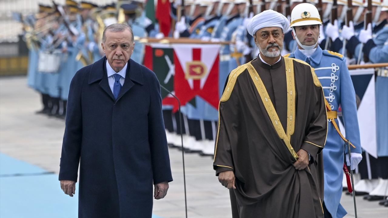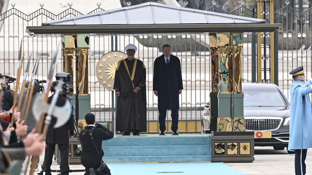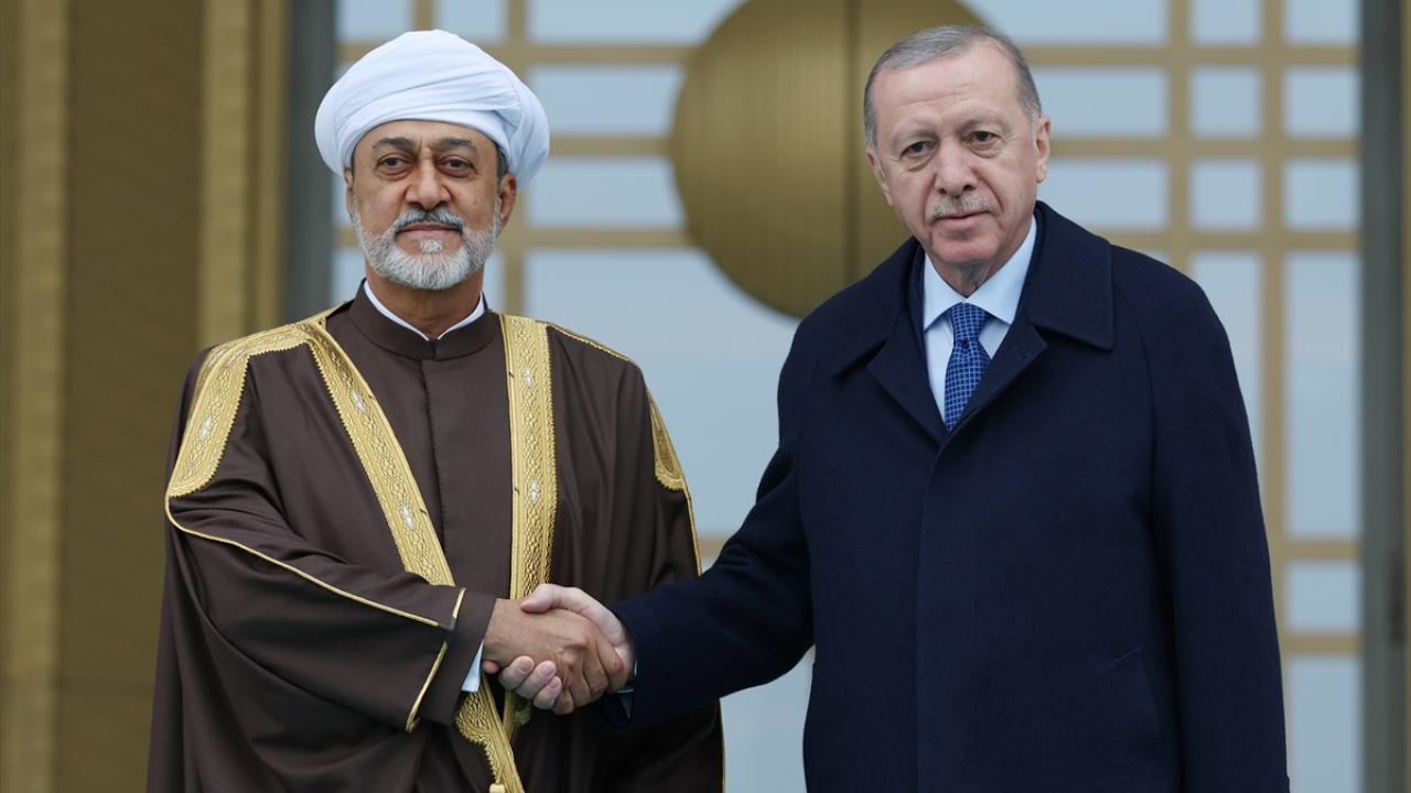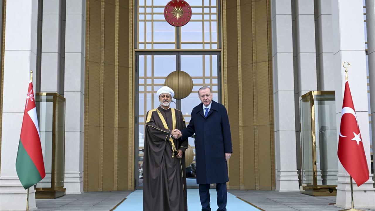 Erdoğan ve Bin Tarık, merdivenlerde Türkiye ve Umman bayrakları önünde tokalaşarak basın mensuplarına poz verdi.