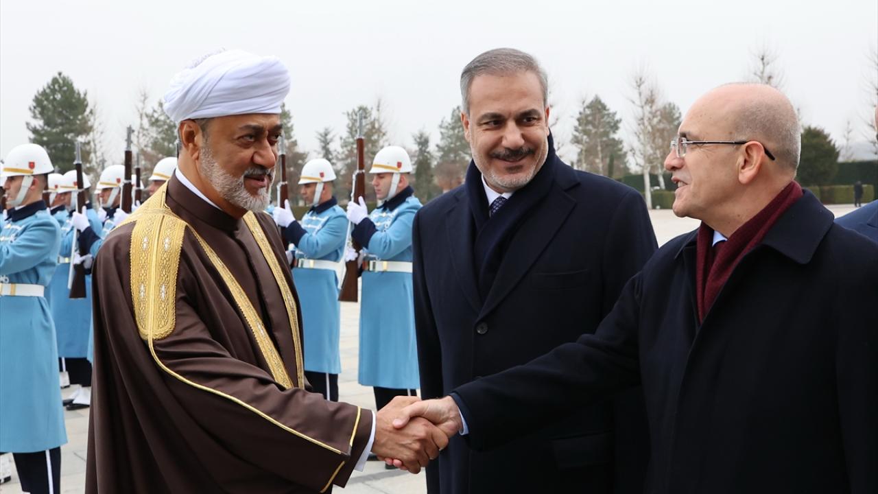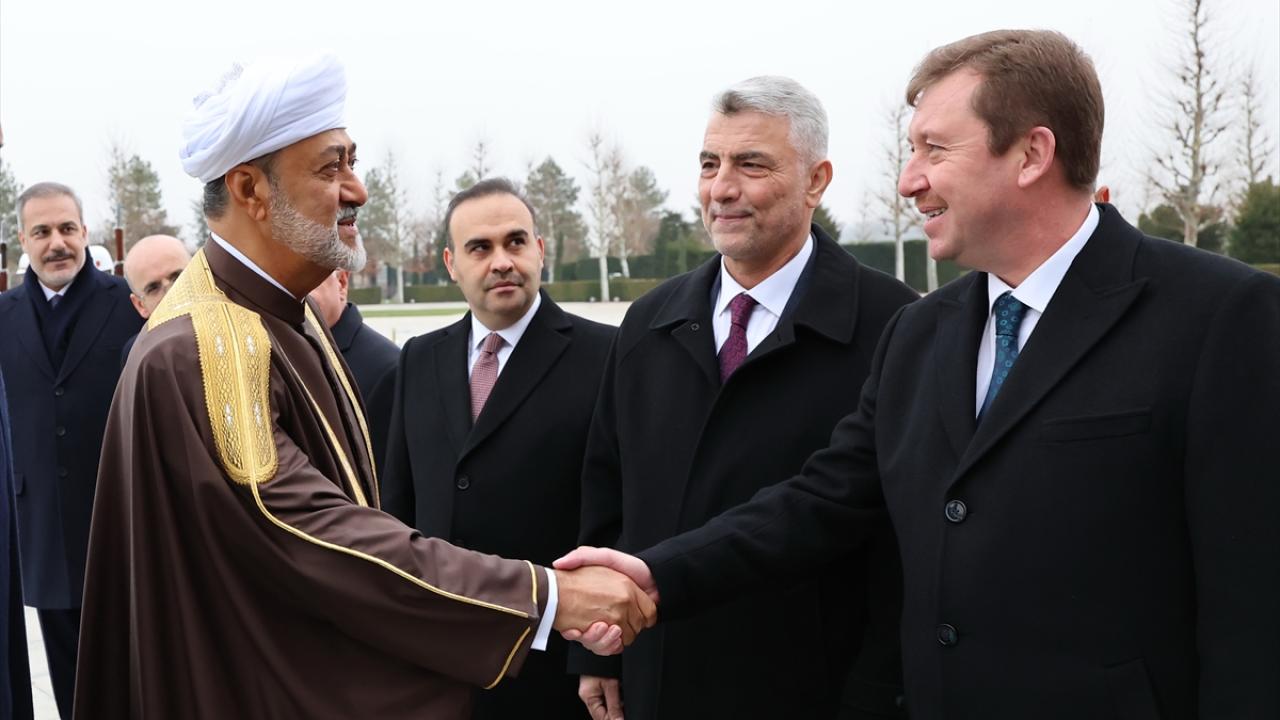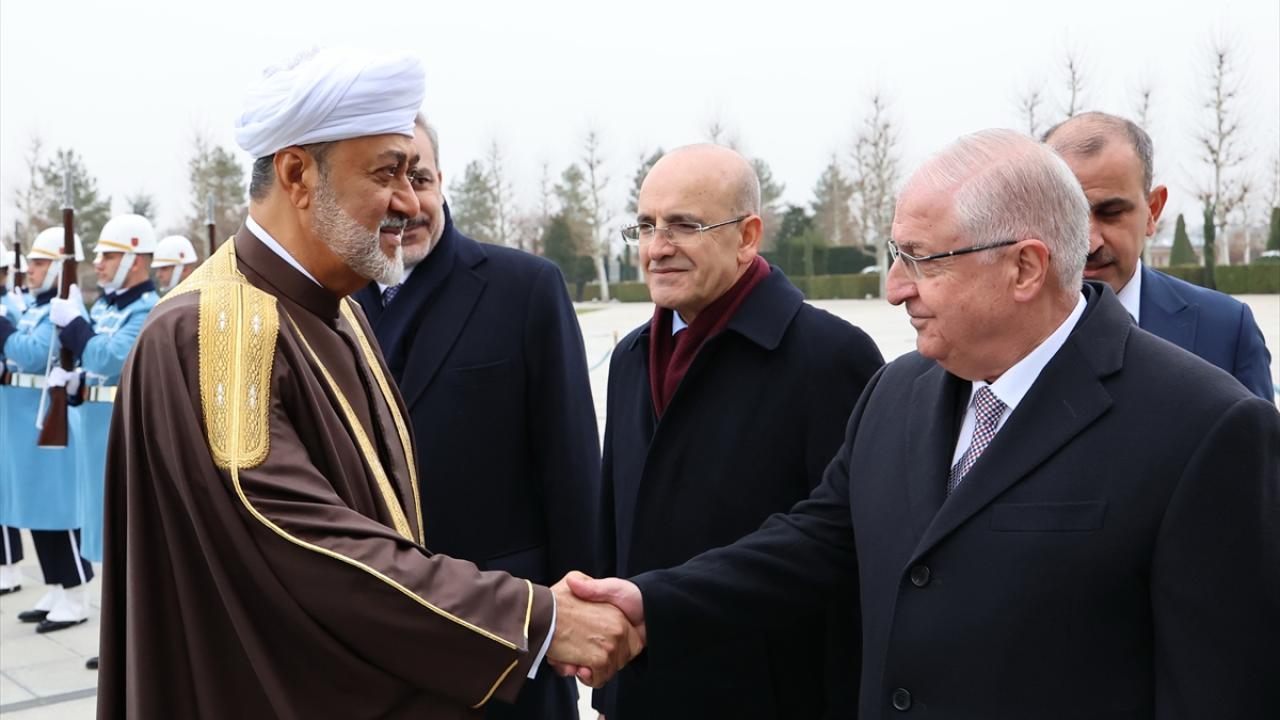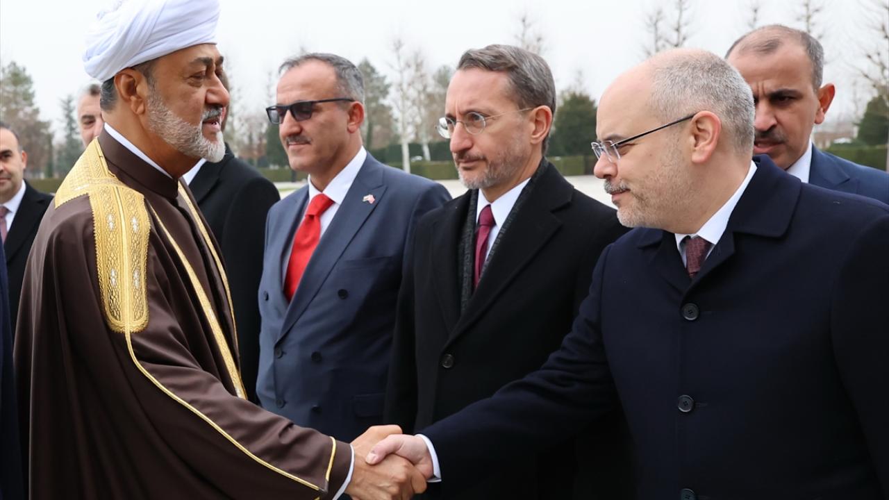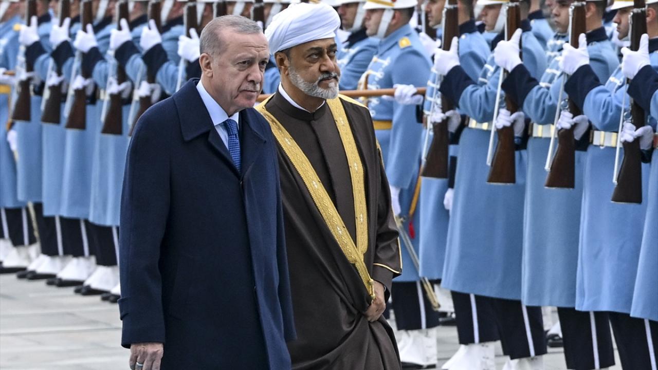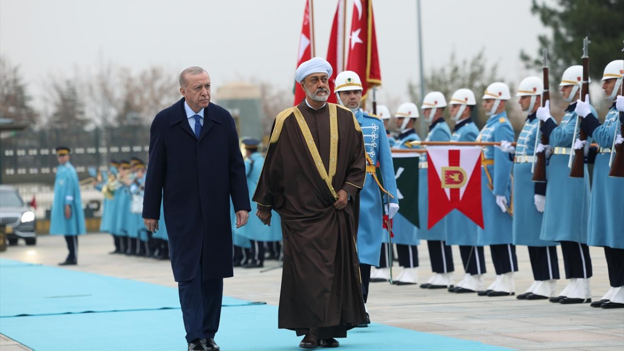 Erdoğan ve Bin Tarık, merdivenlerde Türkiye ve Umman bayrakları önünde tokalaşarak basın mensuplarına poz verdi.