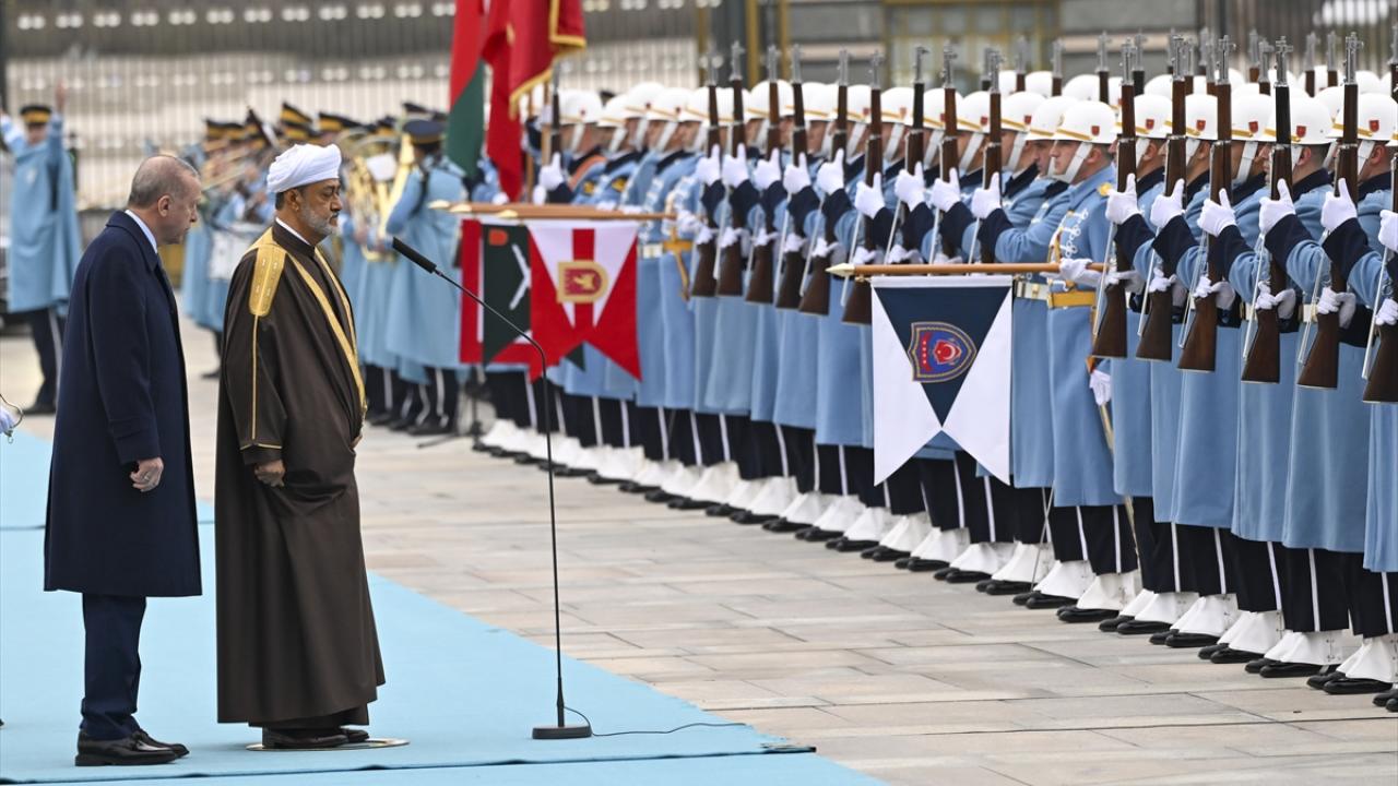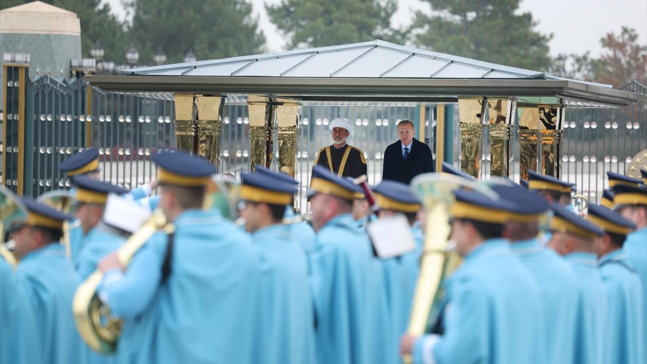 Cumhurbaşkanlığı Külliyesi`nde Erdoğan ve Bin Tarık`ın tören alanındaki yerlerini almasının ardından bando iki ülkenin milli marşlarını çaldı.