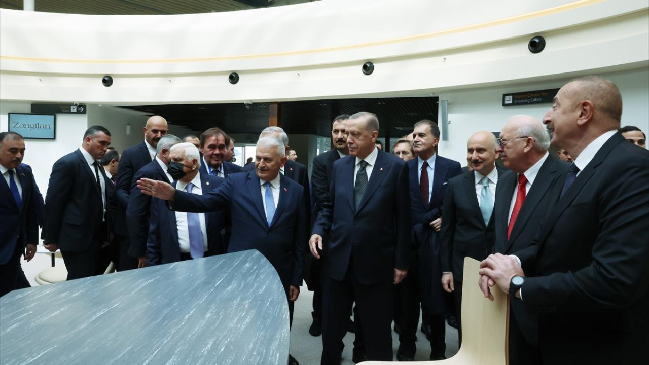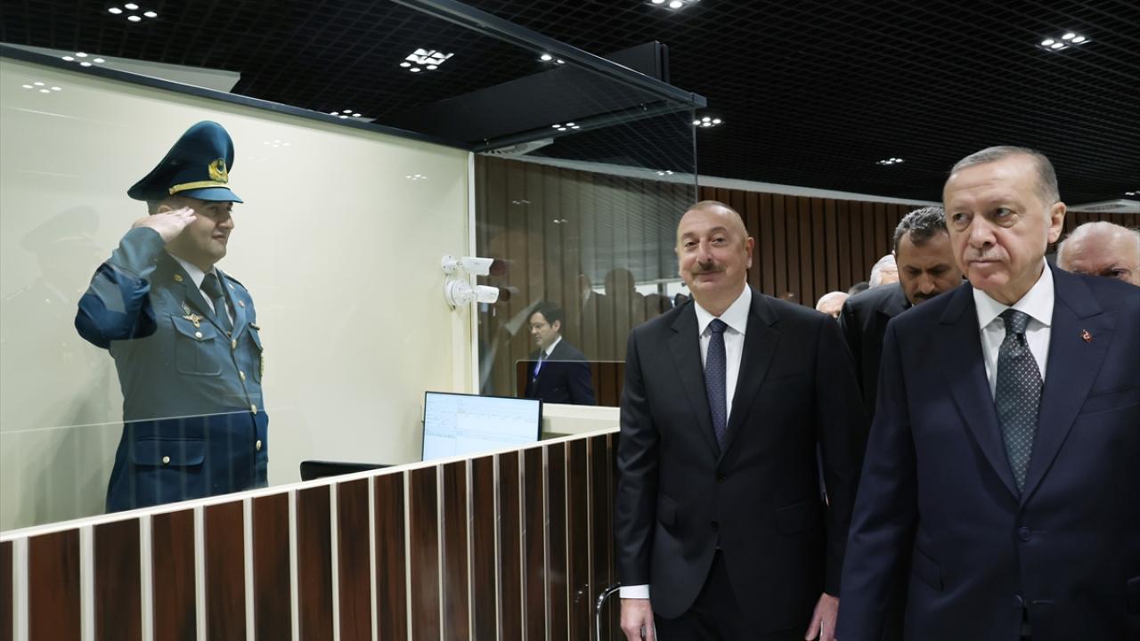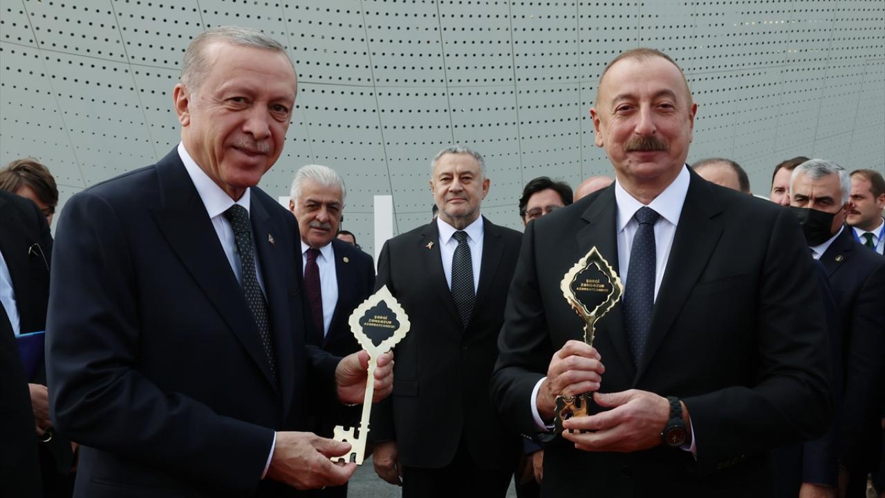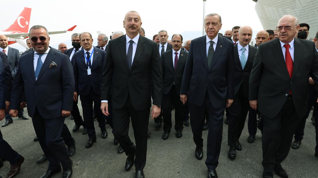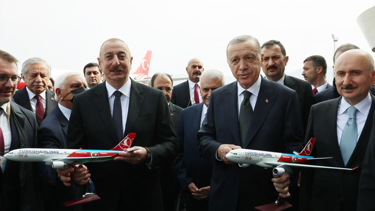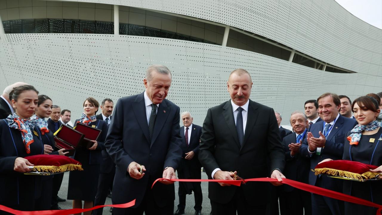 Azerbaycan Cumhurbaşkanı İlham Aliyev tarafından karşılanan Erdoğan, yapımı tamamlanan havalimanına inen ilk devlet başkanı oldu.
