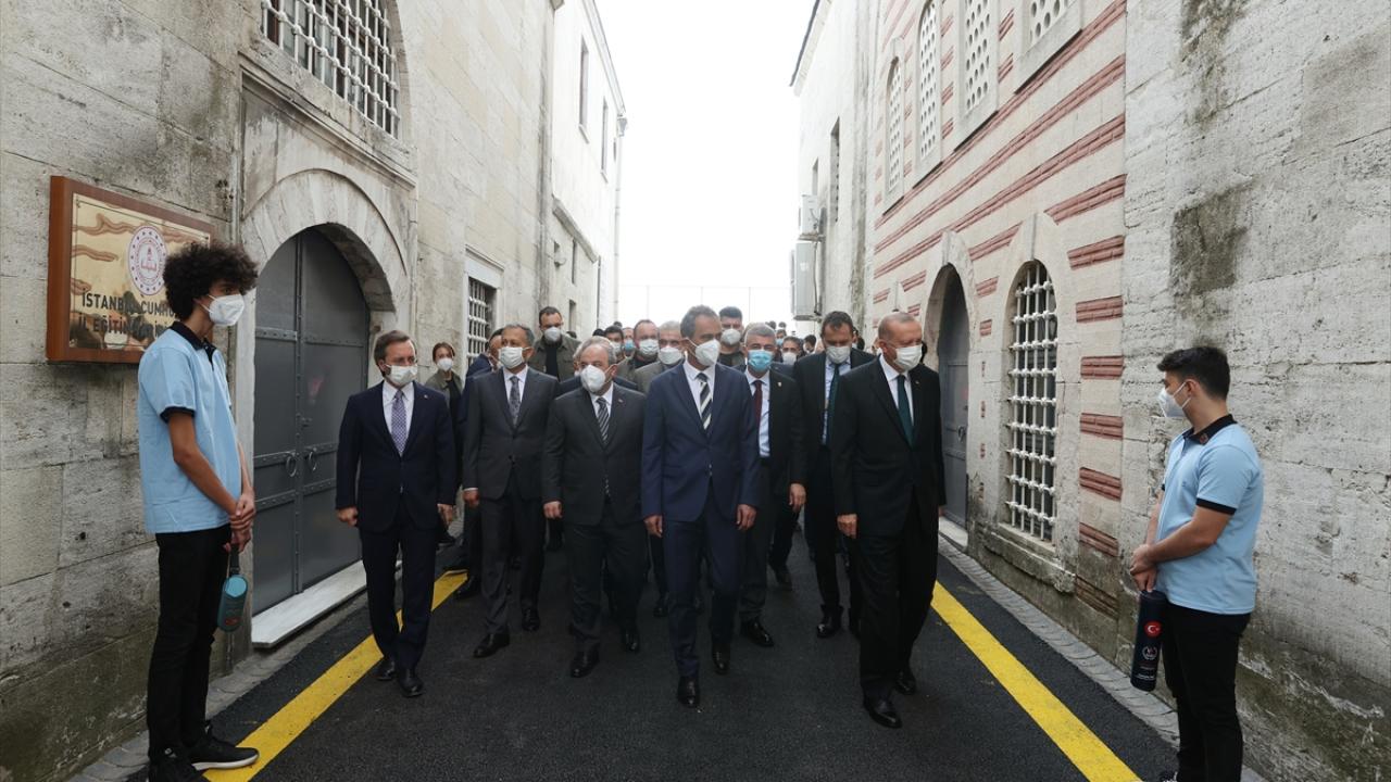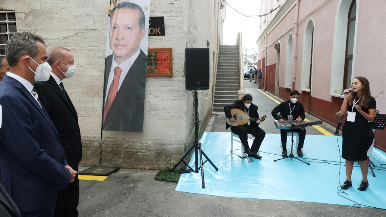 Cumhurbaşkanı Erdoğan, Sultanahmet Mesleki ve Teknik Anadolu Lisesi`ndeki programda yaptığı konuşmanın ardından Milli Eğitim Bakanı Mahmut Özer, öğretmen ve öğrencilerle beraber ders zilini çaldı.