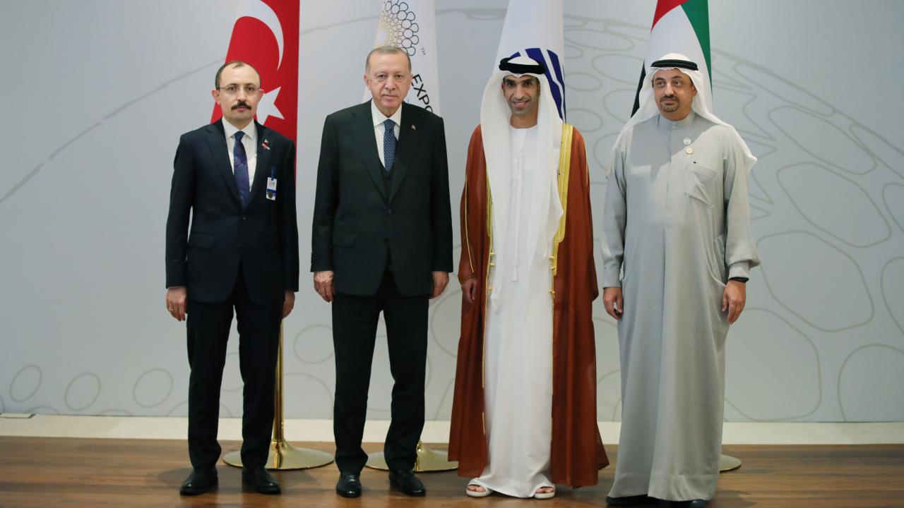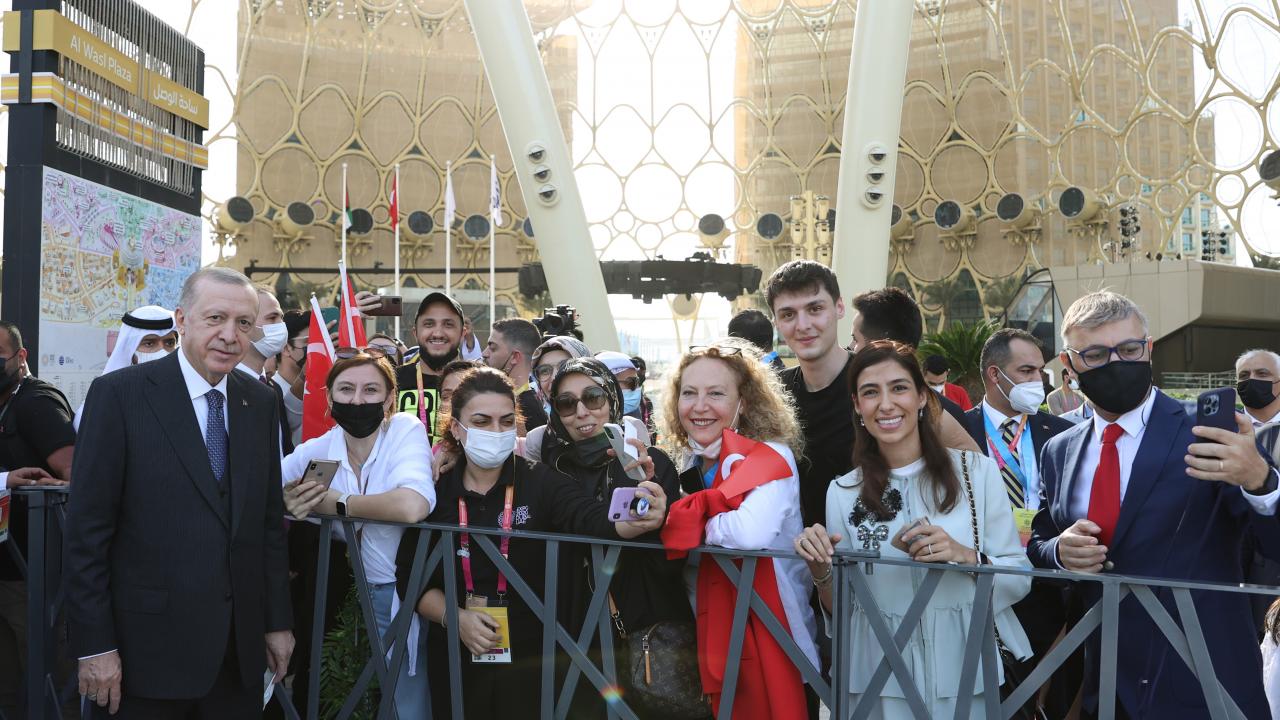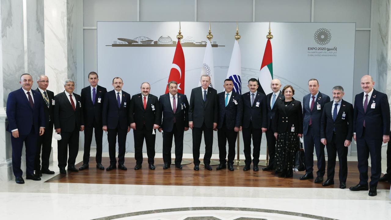 Erdoğan, Dubai Expo 2020`deki liderlik sergi alanında heyetle fotoğraf çektirdi.