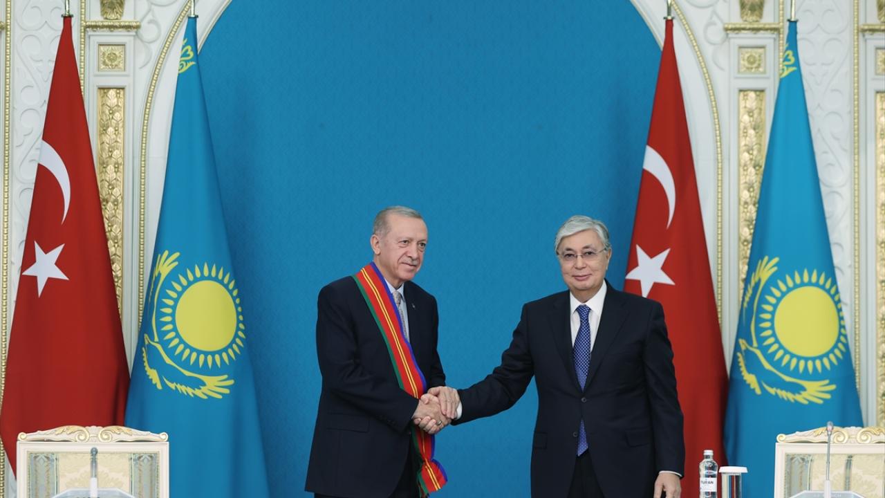 Türkiye-Kazakistan Yüksek Düzeyli Stratejik İşbirliği Konseyi Dördüncü Toplantısı’na katılmak üzere Kazakistan'a giden Cumhurbaşkanı Recep Tayyip Erdoğan'a Kazakistan Cumhurbaşkanı Tokayev tarafından '1. Derece Dostluk Madalyası' takdim edildi.