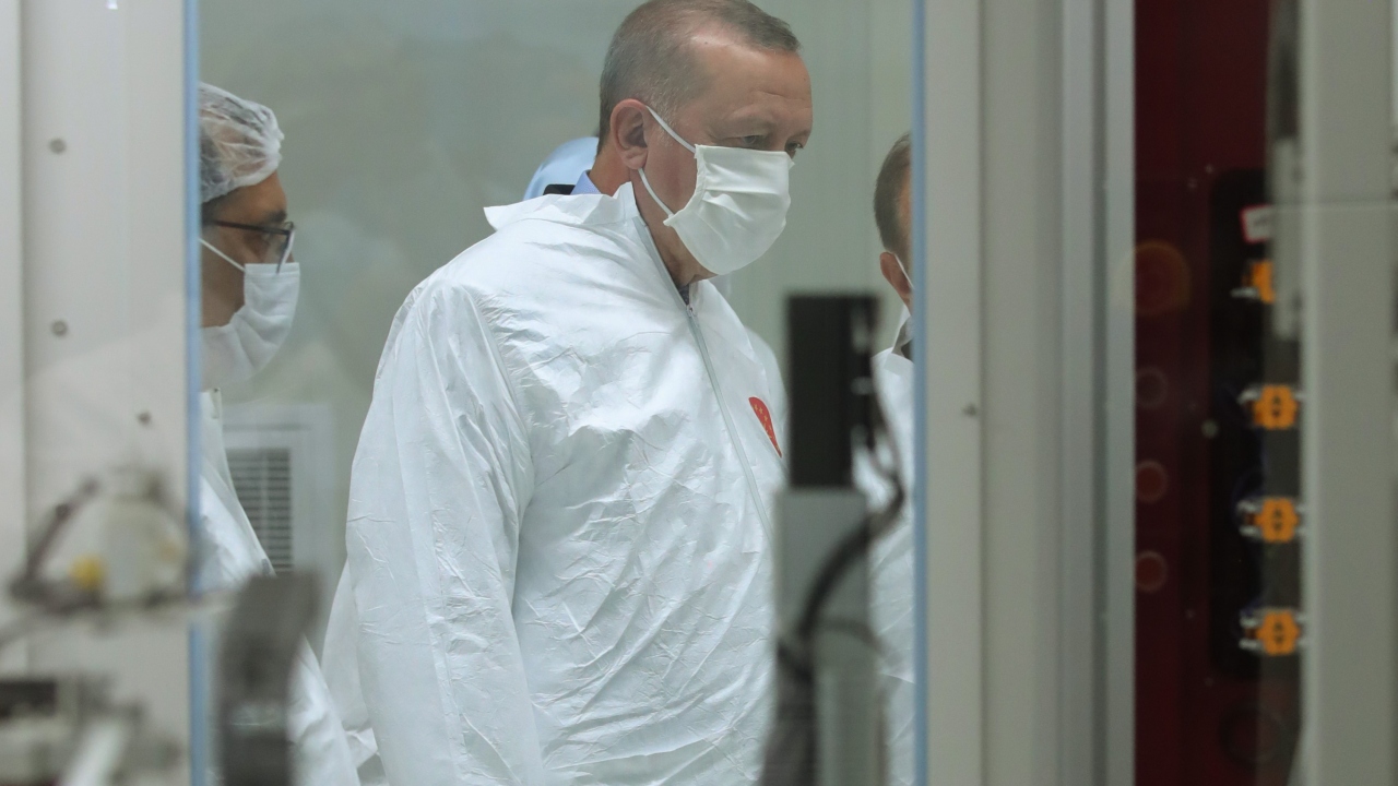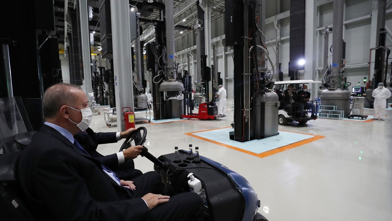 Cumhurbaşkanı Erdoğan, Cumhurbaşkanı Yardımcısı Fuat Oktay (sol 5), Hazine ve Maliye Bakanı Berat Albayrak (sol 4), Sanayi ve Teknoloji Bakanı Mustafa Varank (sağ 4), Enerji ve Tabii Kaynaklar Bakanı Fatih Dönmez (sağ 5), Dışişleri Bakanı Mevlüt Çavuşoğlu (sol 2), Aile, Çalışma ve Sosyal Hizmetler Bakanı Zehra Zümrüt Selçuk (sol 3), Tarım ve Orman Bakanı Bekir Pakdemirli (solda) ve diğer katılımcılar butona basarak açılışı gerçekleştirdi.