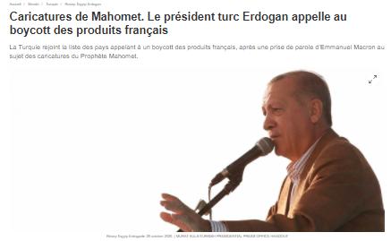 Le Point`te "Türkiye Cumhurbaşkanı Recep Tayyip Erdoğan, Avrupalı yetkilileri, Fransız mevkidaşı Emmanuel Macron`un "liderliğindeki" Müslümanlara karşı "nefret kampanyası" olarak nitelendirdiği şeye son vermeye çağırdı. Fransız ürünlerinin ise boykot edilmesini istedi." denildi.