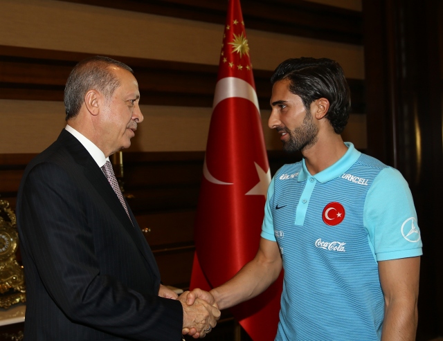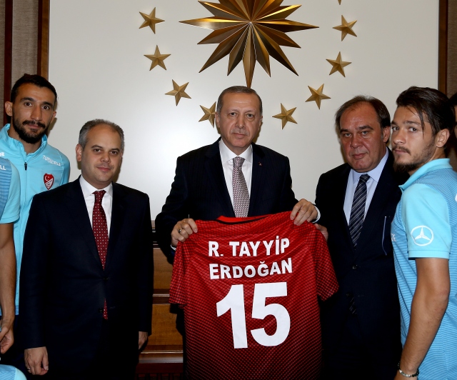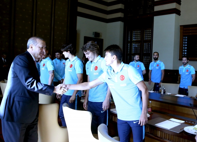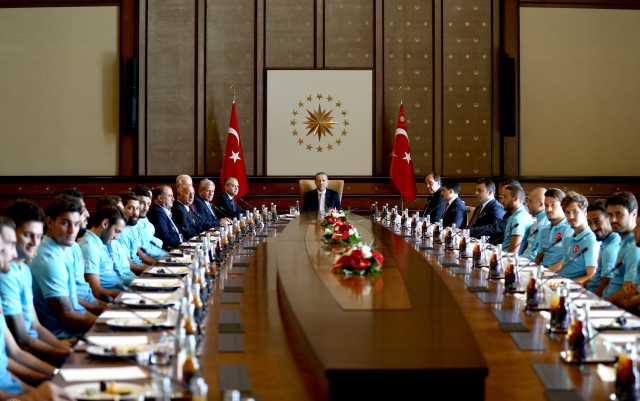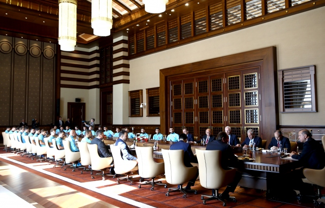 Cumhurbaşkanı Recep Tayyip Erdoğan, Cumhurbaşkanlığı Külliyesi'nde A Milli Futbol Takımı'nı kabul etti. Cumhurbaşkanı Erdoğan, futbolcularla birikte fotoğraf çektirdi.