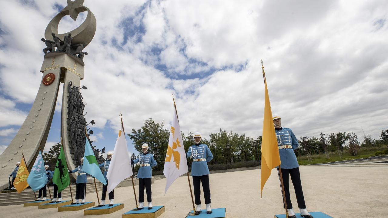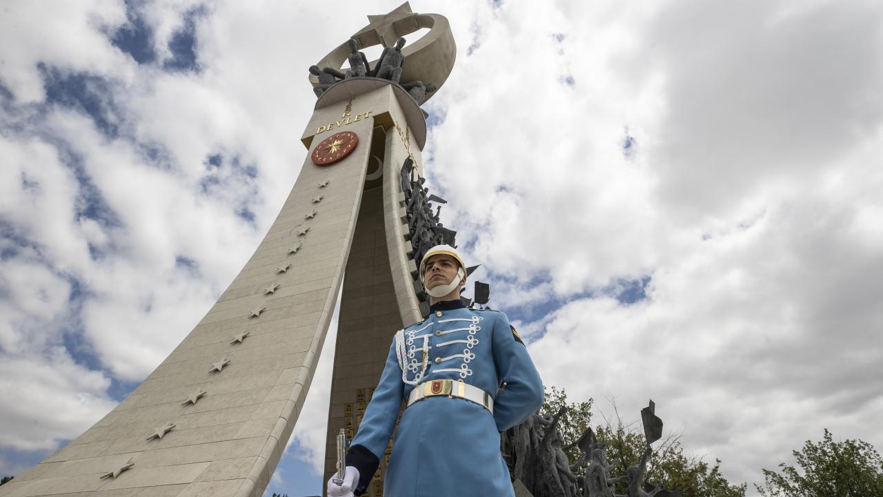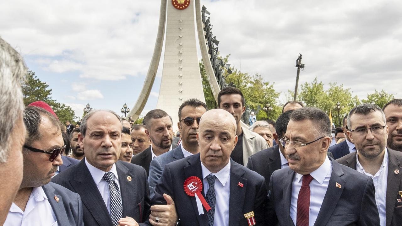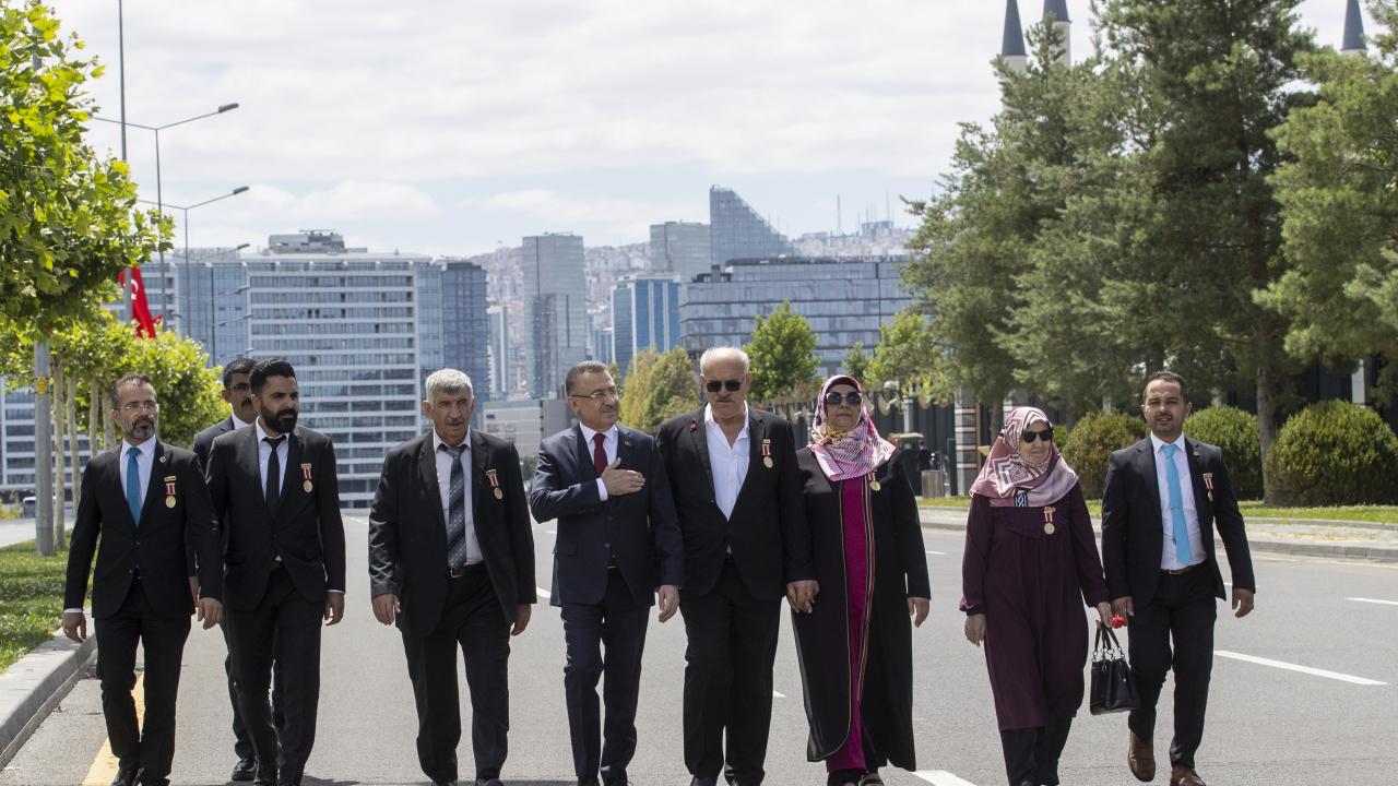 Tören alanına, şehit yakınları ve gazilerle beraber gelen Oktay, anıtın önüne kadar Fetullahçı Terör Örgütü`nün (FETÖ) 15 Temmuz 2016`daki darbe girişiminde vurularak yaralanan dönemin Terörle Mücadele Daire Başkanı Turgut Aslan`la yürüdü.