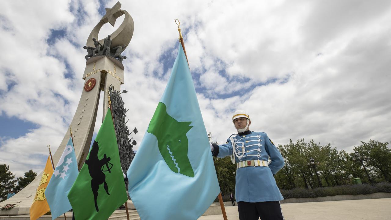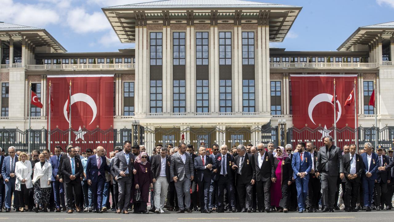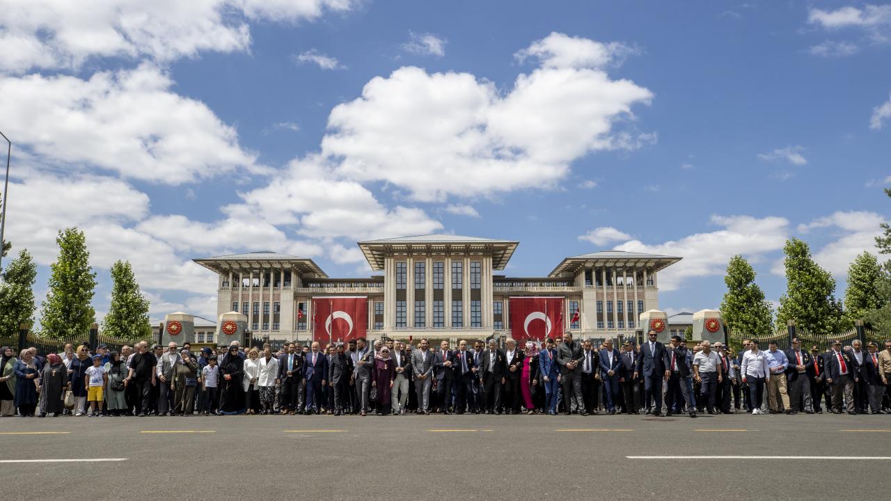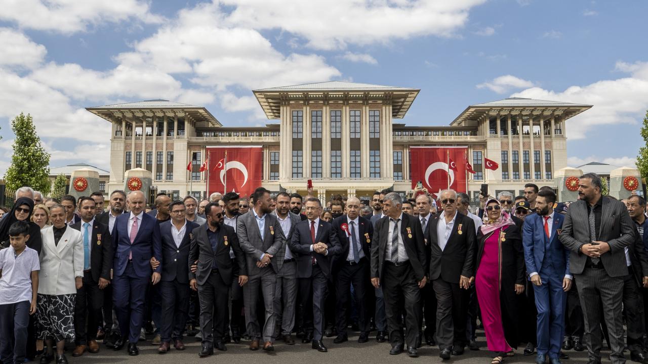 Tören alanına, şehit yakınları ve gazilerle beraber gelen Oktay, anıtın önüne kadar Fetullahçı Terör Örgütü`nün (FETÖ) 15 Temmuz 2016`daki darbe girişiminde vurularak yaralanan dönemin Terörle Mücadele Daire Başkanı Turgut Aslan`la yürüdü.
