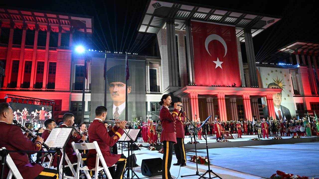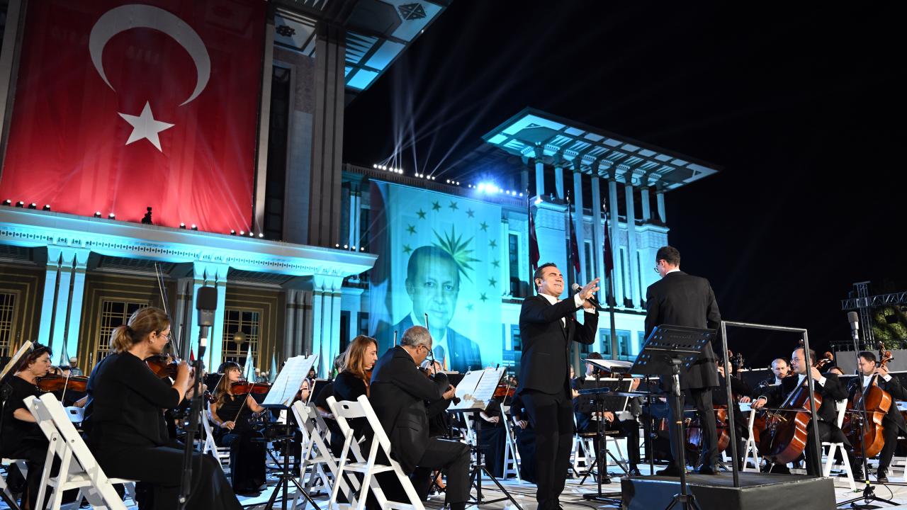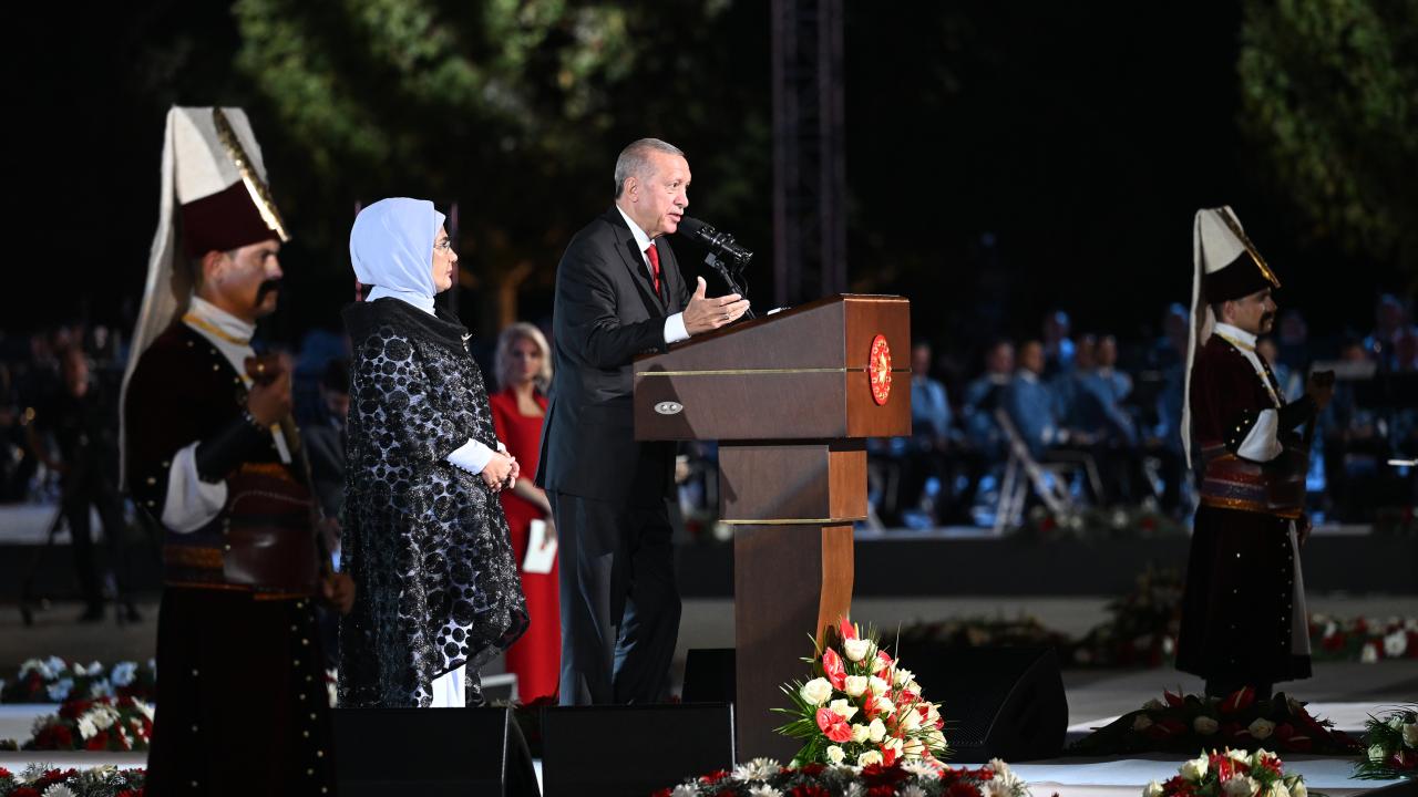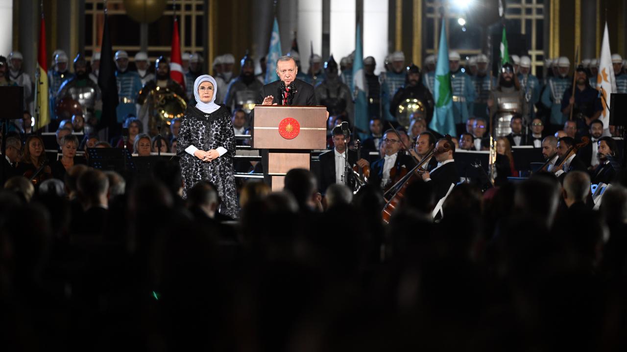 Cumhurbaşkanı Recep Tayyip Erdoğan ile eşi Emine Erdoğan, Cumhurbaşkanlığı Külliyesi'nde düzenlenen 30 Ağustos Zafer Bayramı Özel Konseri ve 100. Yıl Marşı Tanıtım Programına katıldı. Cumhurbaşkanı Erdoğan, konser öncesi konuşma yaptı.