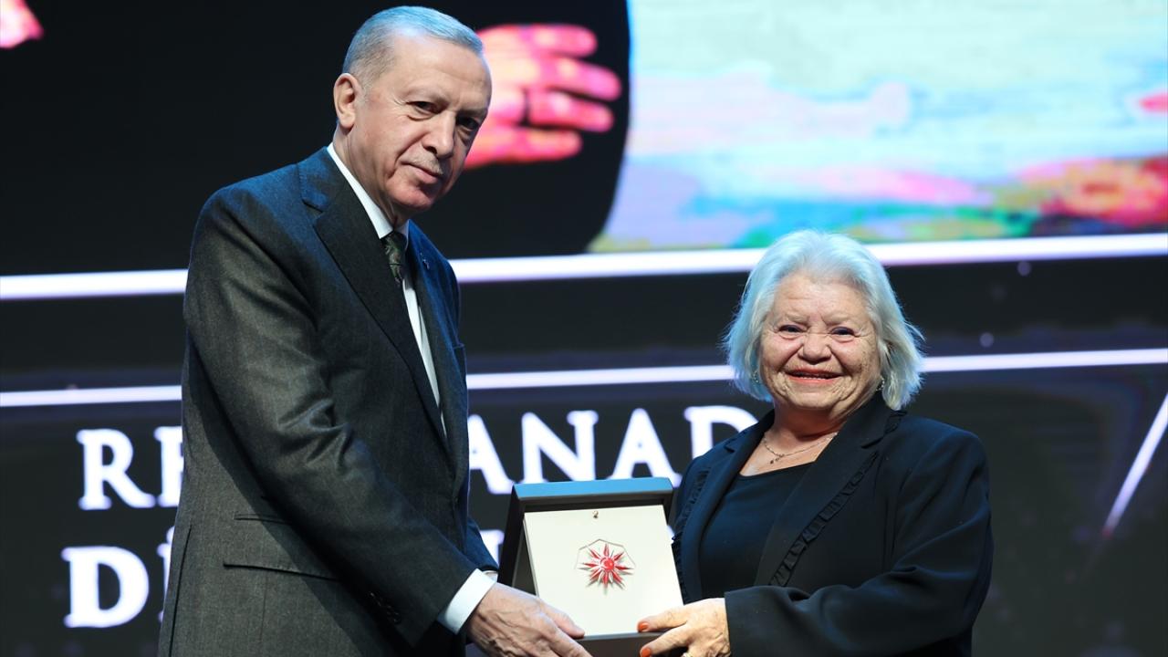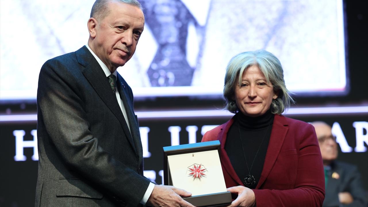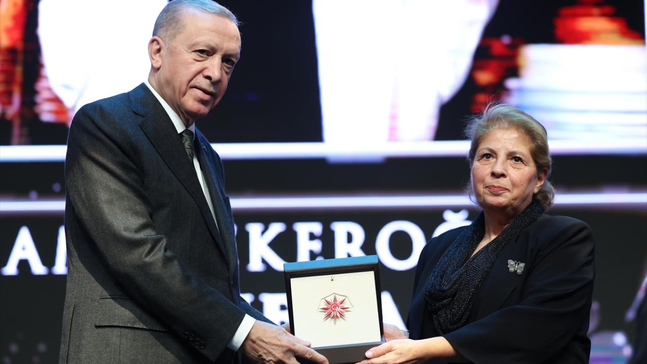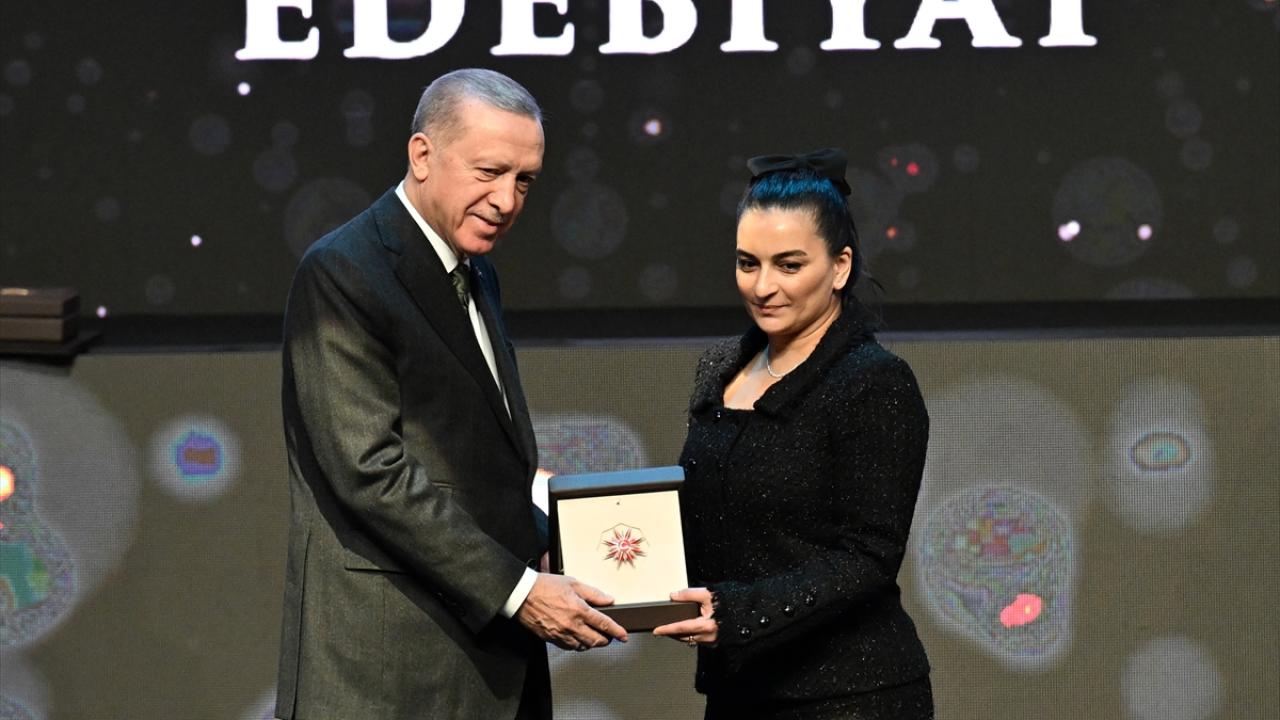 Cumhurbaşkanı Erdoğan, programda edebiyat dalındaki ödülü, Nazan Bekiroğlu adına Leyla Didar Bekiroğlu`na takdim etti.