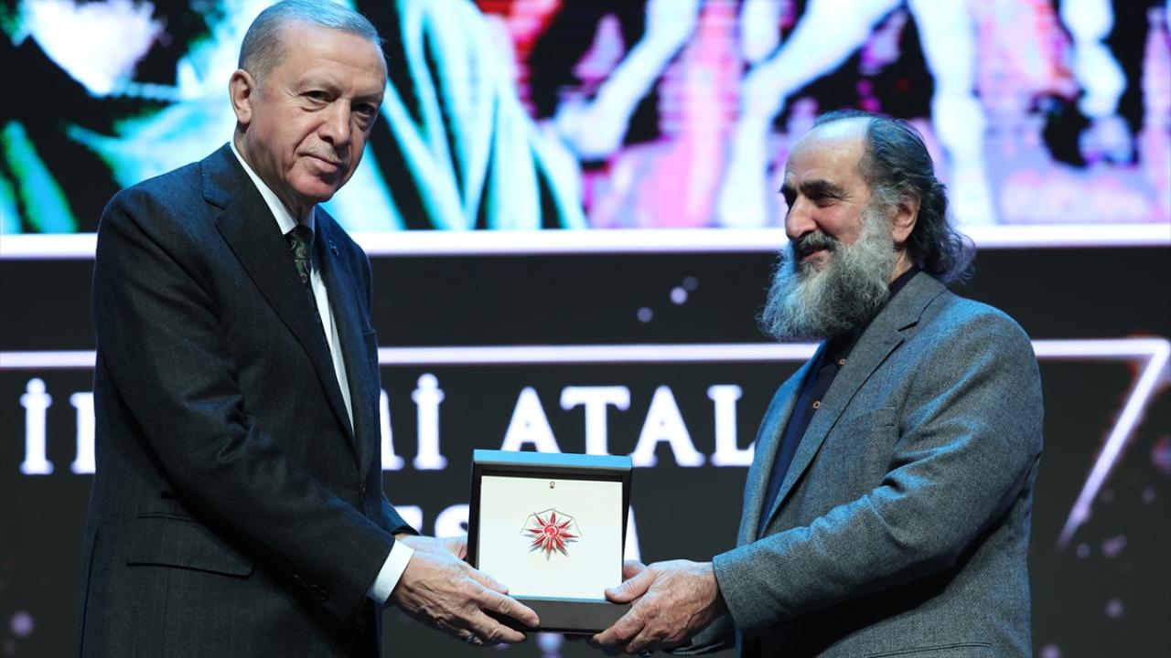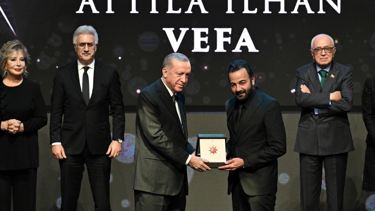 Cumhurbaşkanı Erdoğan, programda edebiyat dalındaki vefa ödülünü, Attila İlhan adına Kerem Alışık`a (sağda) takdim etti.