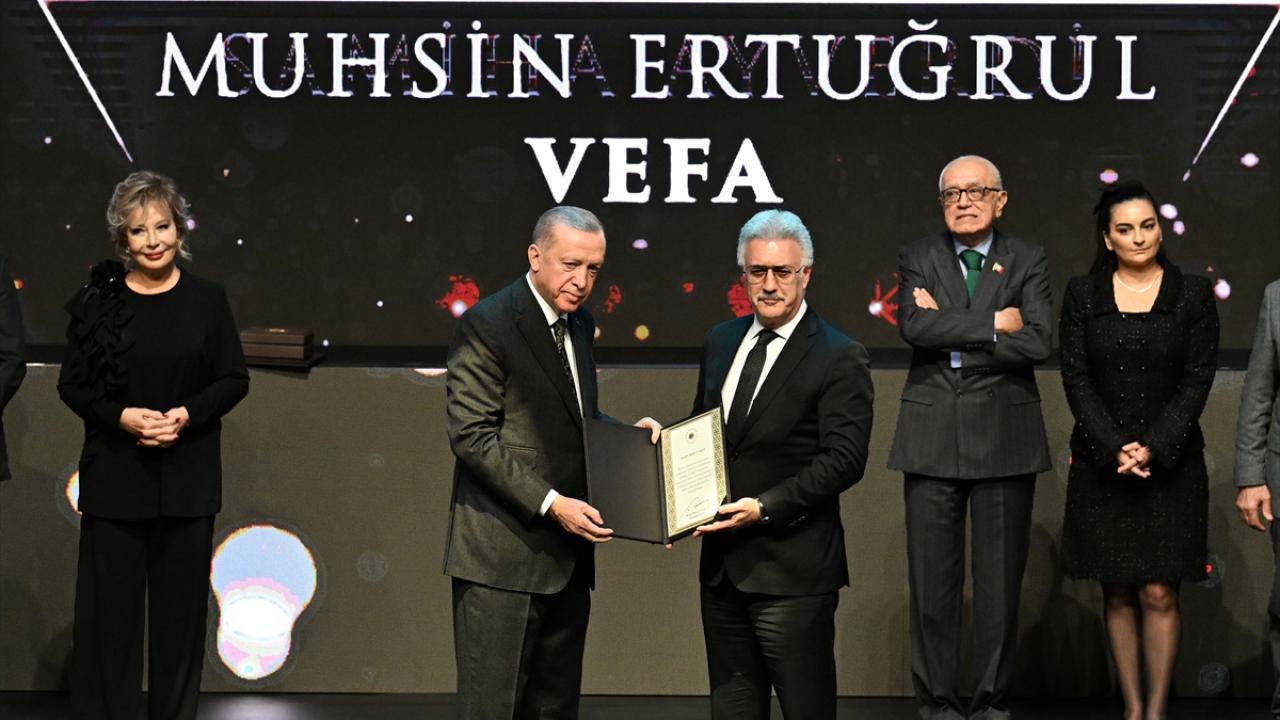 Cumhurbaşkanı Erdoğan, programda tiyatro dalındaki vefa ödülünü, Muhsin Ertuğrul adına Tamer Karadağlı`ya takdim etti.