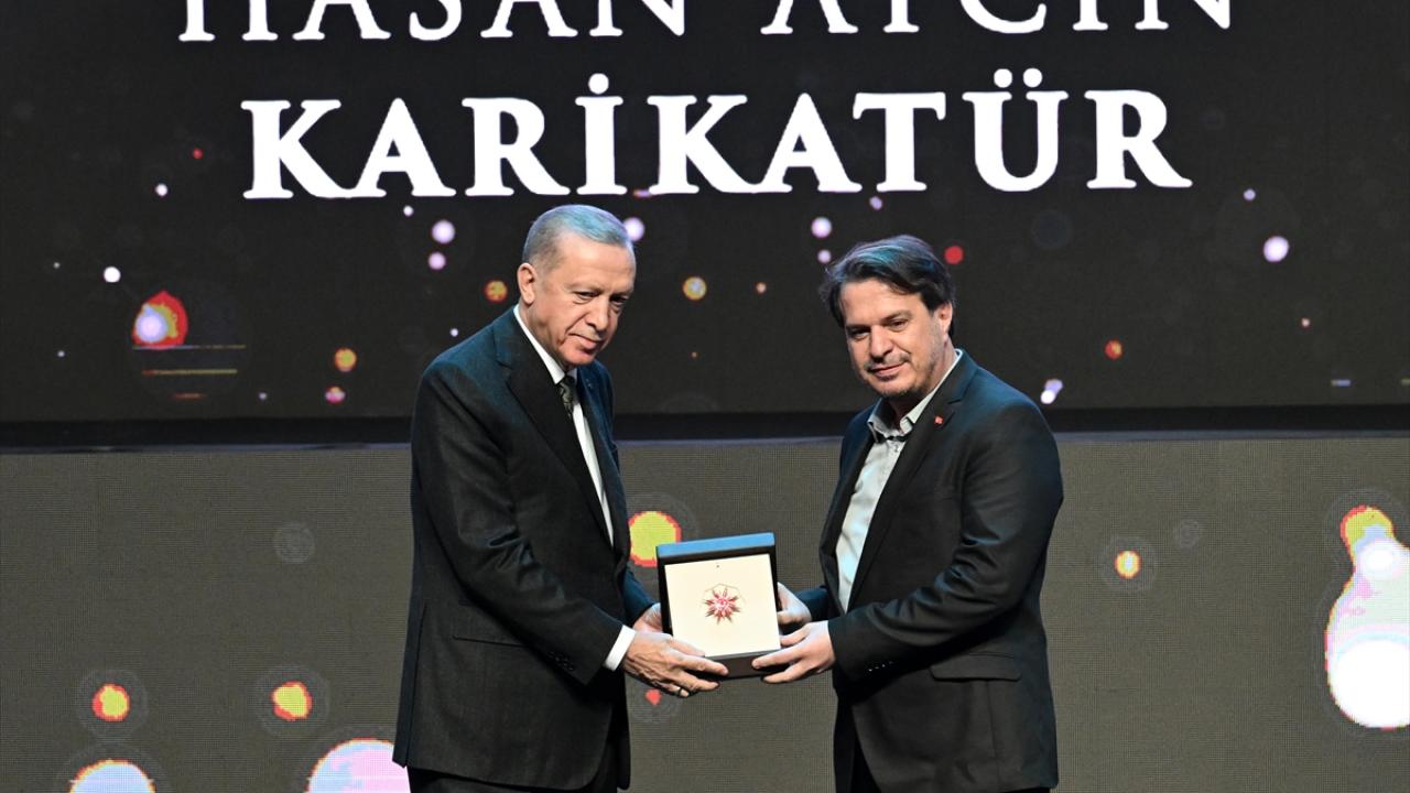 Cumhurbaşkanı Erdoğan, programda karikatür dalındaki ödülü, Hasan Aycın adına Harun Selman Aycın`a takdim etti.
