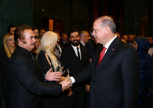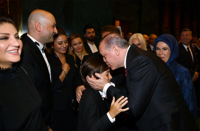 Cumhurbaşkanı Erdoğan, resepsiyona katılan sanatçı Serkan Çağrı ve sinema oyuncusu Necati Şaşmaz ile fotoğraf çektirdi.