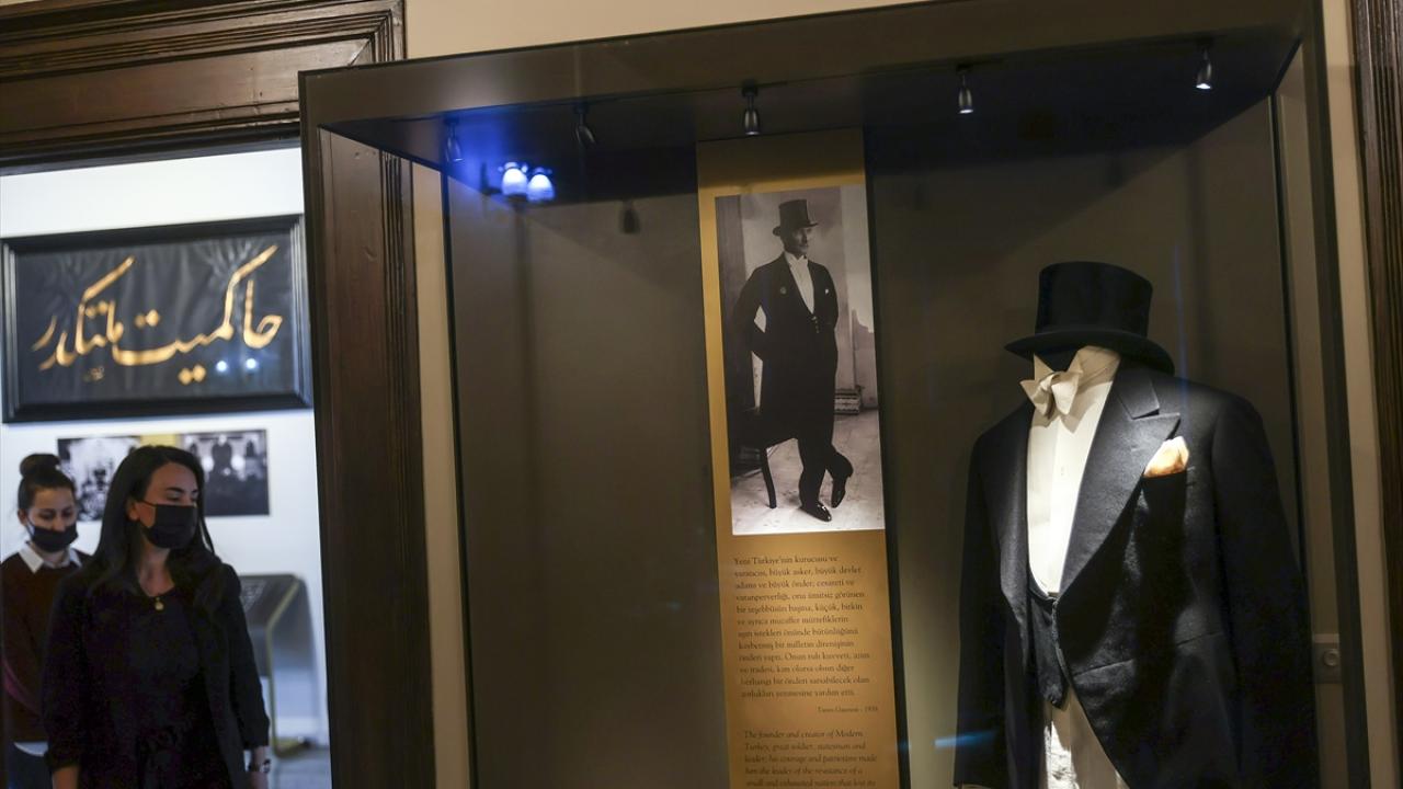 Müdür Bahar Çakırhan, "Atatürk jaketatay takımını da burada sergiliyoruz. Arkası yuvarlak ve uzun, arkası kısa olan bu takım elbise, muhakkak çizgili pantolonlarla tamamlanıyor. Bu takım, Atatürk`ün resepsiyonlarda giydiği kıyafeti. 42 numara olan Beyoğlu`nda bir Ermeni ustanın elinden çıkan ayakkabıları da sergiliyoruz. Papyonunda Türk Ocağı damgası var. Atatürk vefat ettiğinde terekesi toplanarak, eşyaların kullanılıp kullanılmadığı bir komisyon tarafından tespit ediliyor ve kullanılan objeler, Türk Ocağı tarafından damgalanıyor. Bu yüzden papyonu da damgalı." dedi.