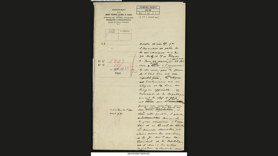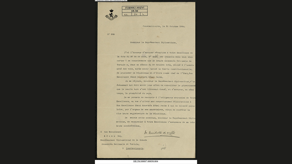 Belgelerde, TBMM`nin 29 Ekim 1923`teki toplantısında, Türkiye Devleti hükümet şeklinin "Cumhuriyet" olarak kabul edildiği ve Gazi Mustafa Kemal Paşa`nın "Cumhurbaşkanı" seçildiği bilgisi ile bunun İstanbul`daki sefir ve mümessillere Dersaadet Murahhaslığınca tebliğ edildiği görülüyor.