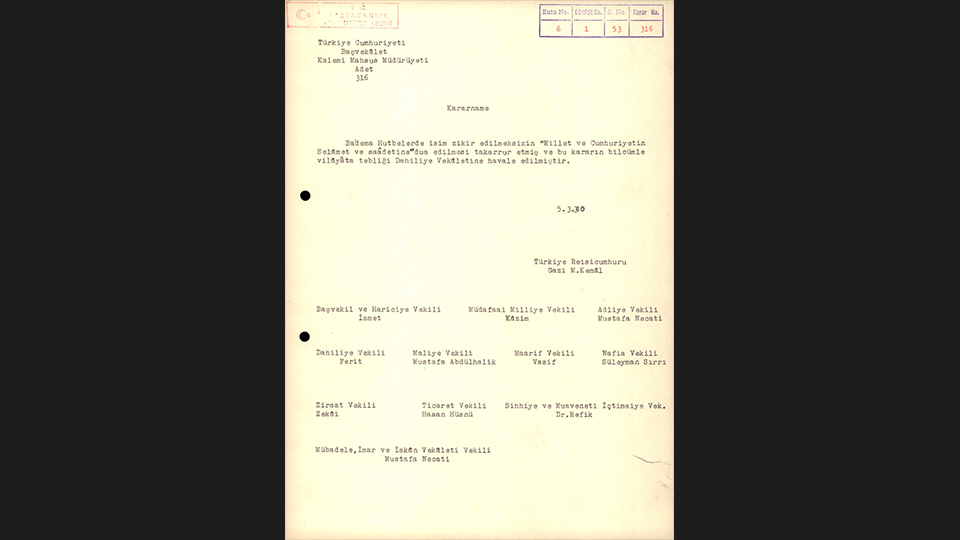 Hutbelerde "ad anmaksızın" millet ve Cumhuriyet`in saadet ve selameti için dua edilmesi hususunda vilayetlere tebligatta bulunulduğu, 5 Mart 1924 tarihli belgede, "Cumhuriyet" unvanıyla çıkarılacak ajanda, takvim ve defterlere resminin basılması hususunda Mustafa Kemal Paşa`nın izninin Ticaret Bakanlığına bildirildiği" 16 Mart 1924 tarihli bir başka belgede belirtiliyor.