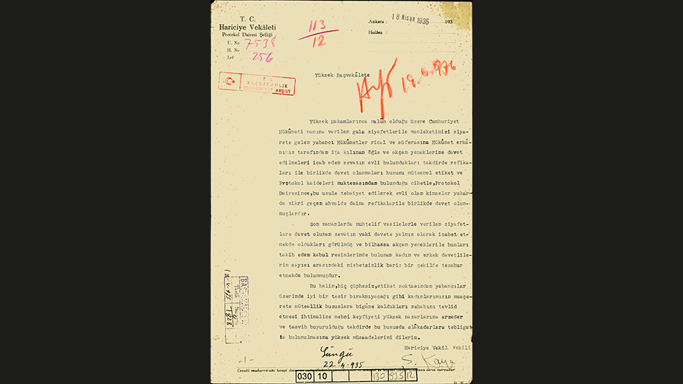 Cumhuriyet Hükümeti adına verilen ziyafet ve davetlere gelecek kişilerin eşlerini de getirmelerine dair talep içeren belge ise kadınlara verilen haklar konusundaki önemi gösteriyor.