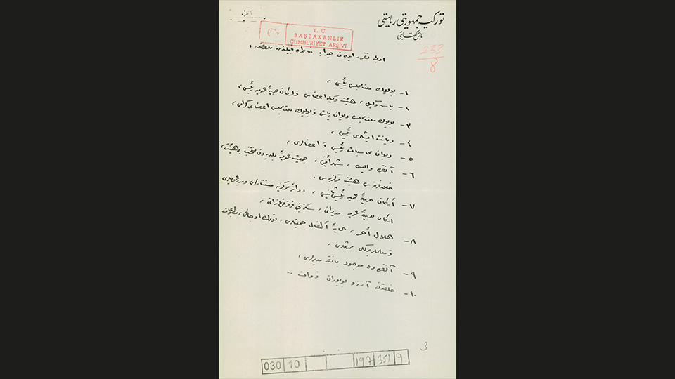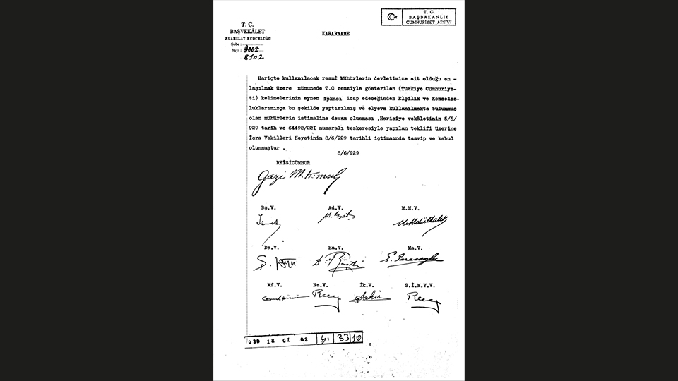 Yurt dışında kullanılacak resmi mühürlerin Türk Devleti`ne ait olduğunun anlaşılması için "Türkiye Cumhuriyeti" sözünün kullanılması hakkındaki belge de arşiv kayıtlarında dikkat çekiyor.