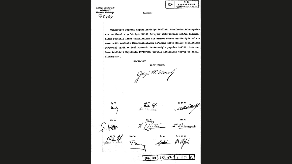 Cumhuriyet Bayramı kutlamalarında ülke genelinde akşamları minarelerin ışıklarının yakılmasına ilişkin talimat ile Milli Saraylar Müdürlüğü`nde bulunan yemek takımlarının Cumhuriyet Bayramı töreni dolayısıyla Ankara Palas`ta verilecek ziyafetler için Ankara`ya sevkine dair 1928 ve 1929 tarihli belgeler dikkati çekiyor.