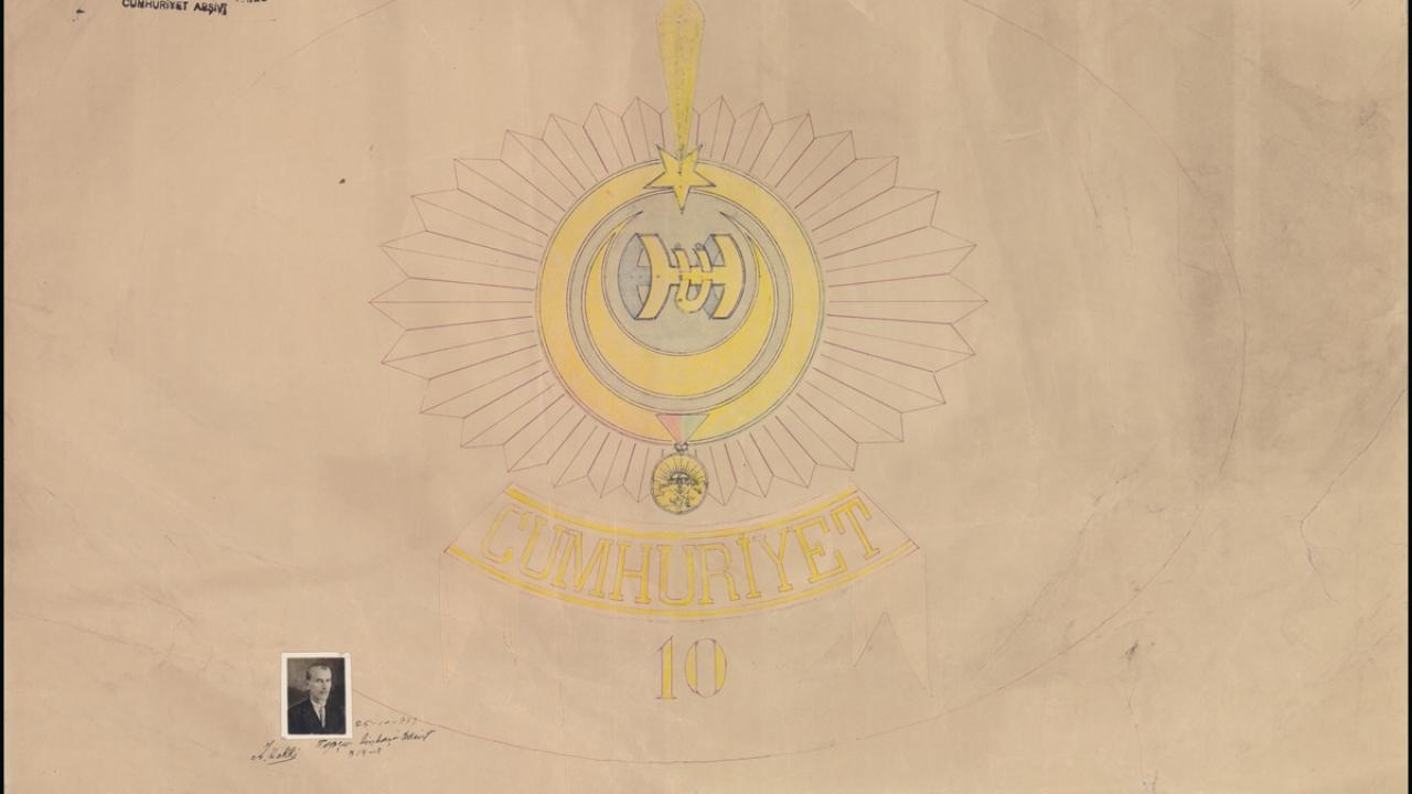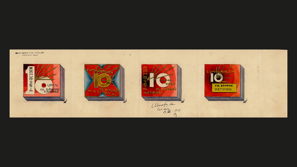 Cumhuriyet`in 10. yıl kutlamaları için günün anlam ve özelliğini anlatan farklı alanlarda kullanılabilecek logo tasarımları da arşivlerde muhafaza ediliyor.