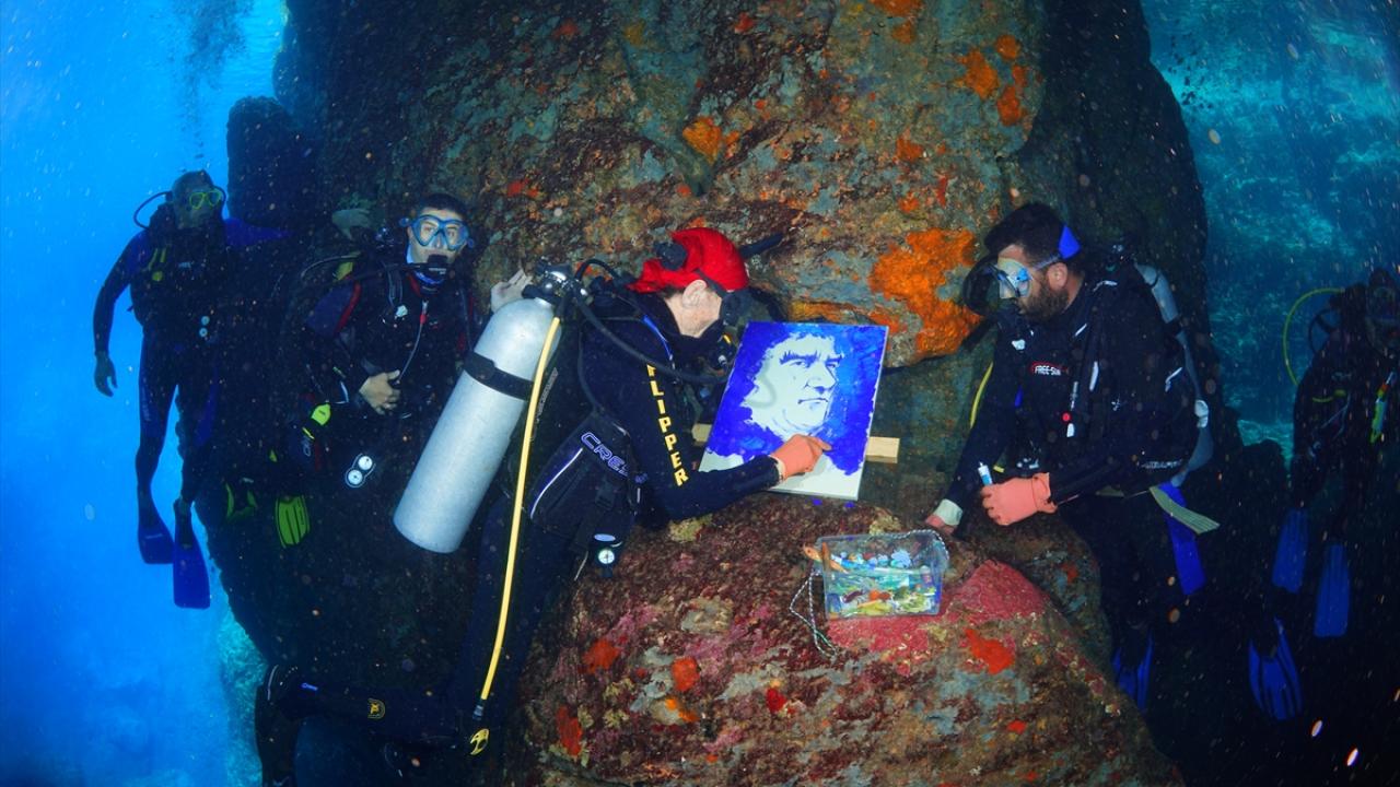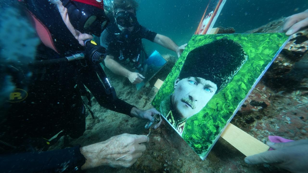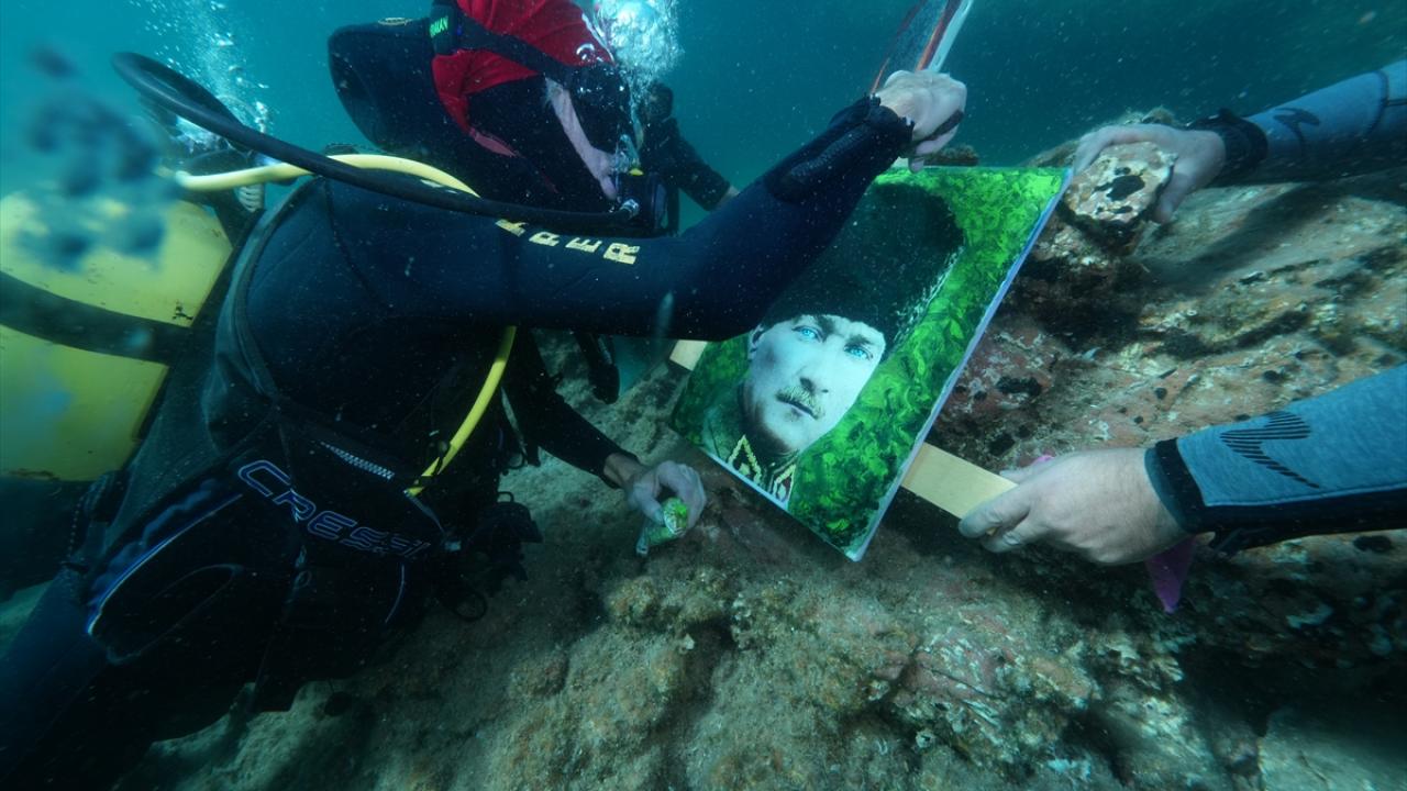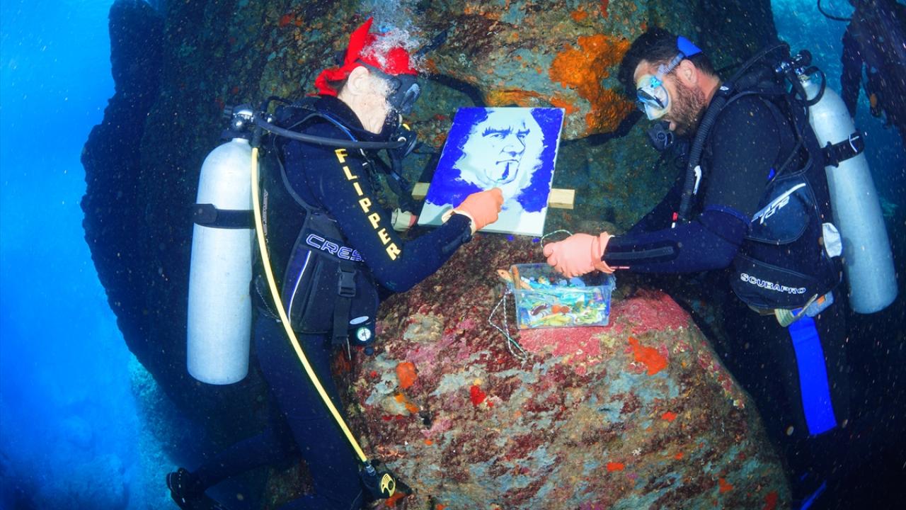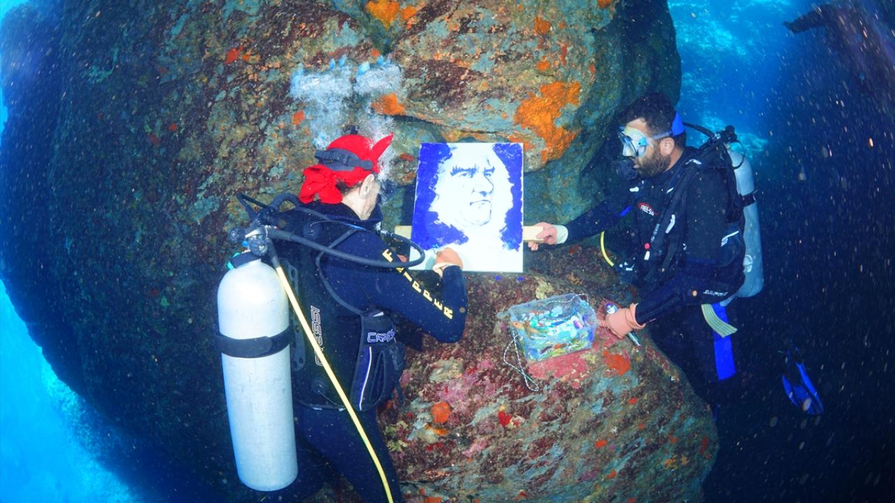 Ressam Mustafa Ali Kasap`ın çizdiği 3 Atatürk portresini de yanına alan Totrakan, su altında spatula ve suda dağılmayan, deniz ekosistemine zarar vermeyen özel boyalarla portreleri renklendirdi.