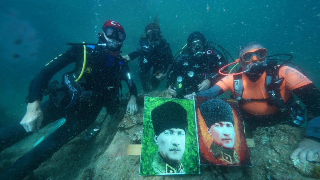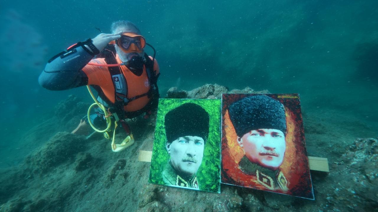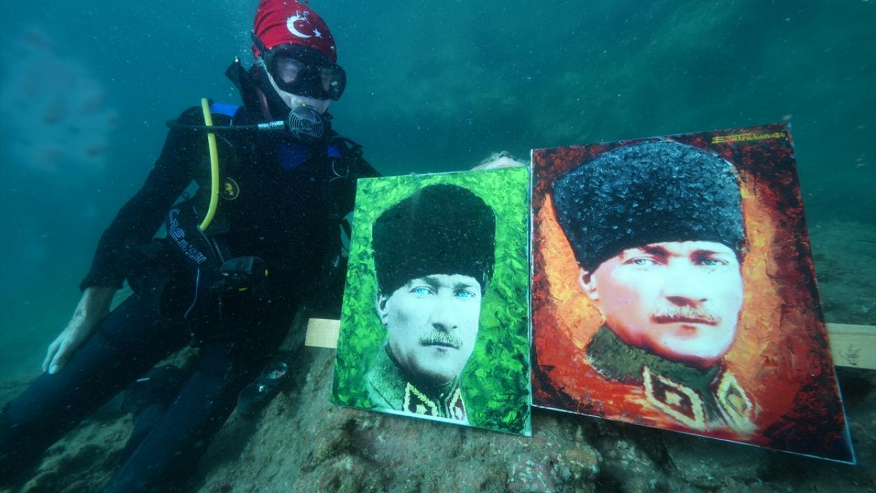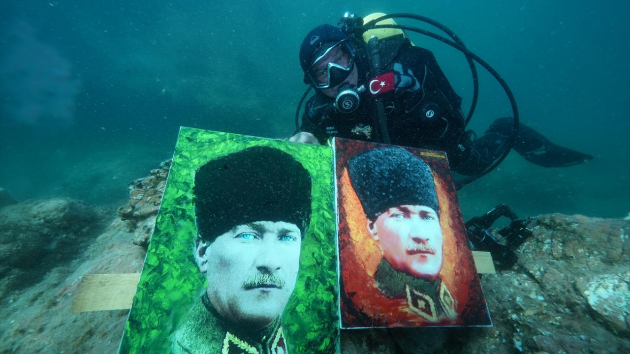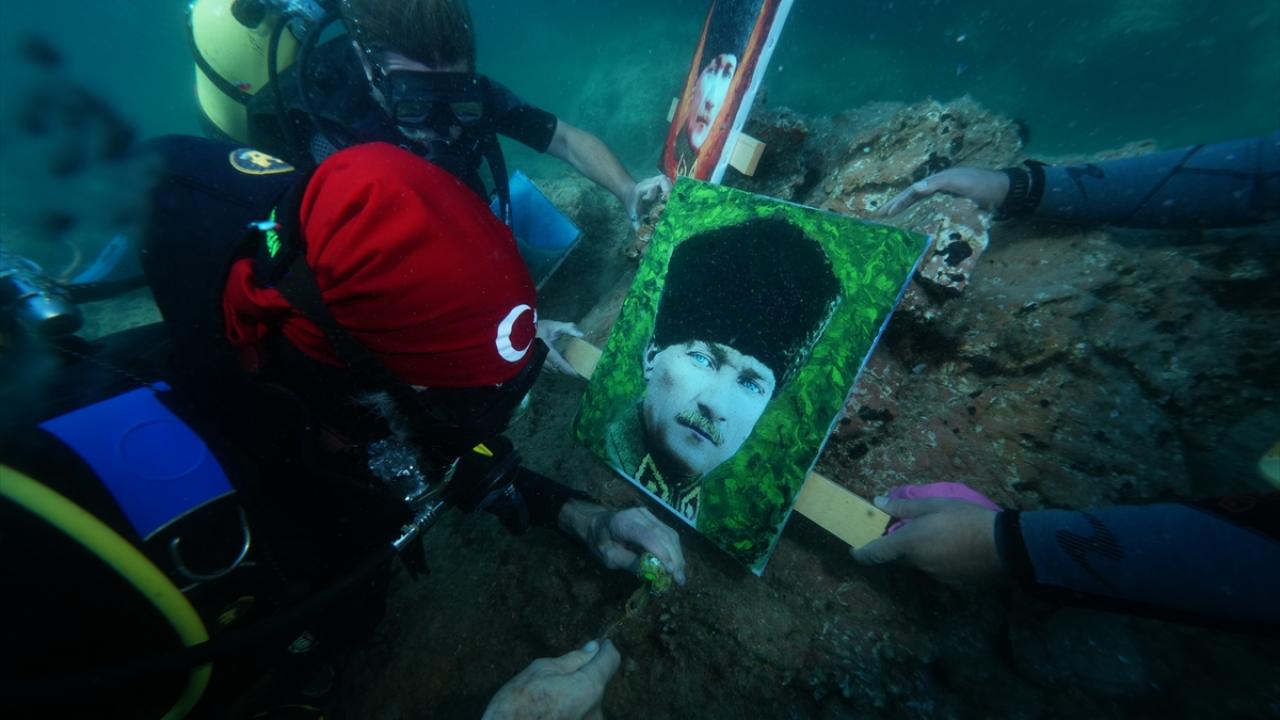 Ressam Mustafa Ali Kasap`ın çizdiği 3 Atatürk portresini de yanına alan Totrakan, su altında spatula ve suda dağılmayan, deniz ekosistemine zarar vermeyen özel boyalarla portreleri renklendirdi.