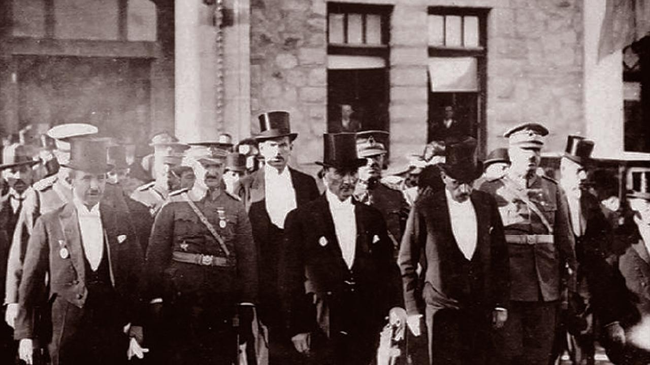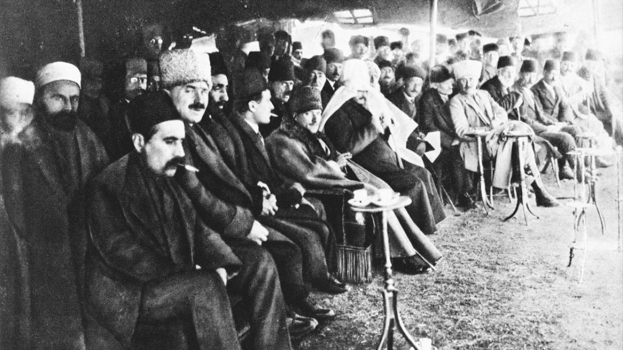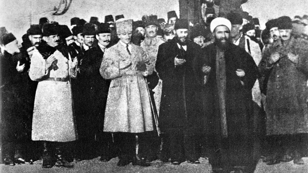 Mustafa Kemal Atatürk (açık renk kalpaklı), heyeti temsiliye üyeleri ile 27 Aralık 1919`da Ankara`ya gelişinde, Hükümet Konağı önünde Nevşehirli Hasan Fehmi Efendi (önde sakallı) tarafından yapılan dua sırasında. (Arşiv)