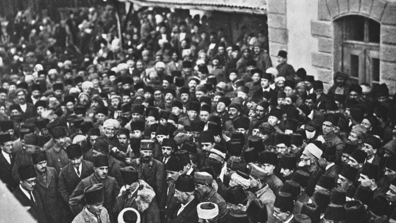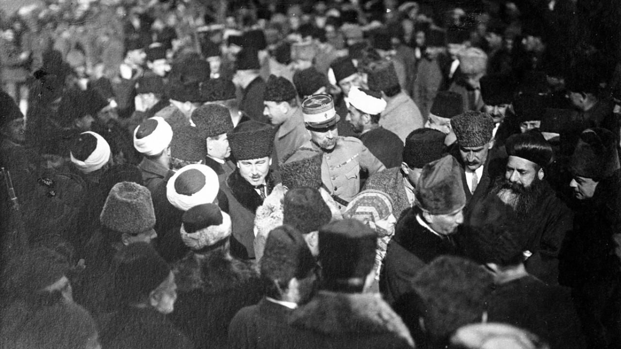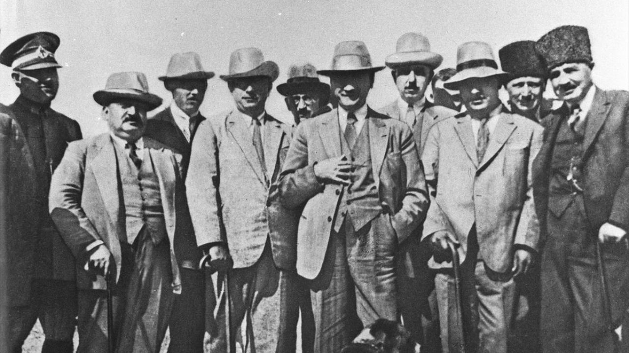 Mustafa Kemal Atatürk (solda açık renk montlu), 1922`de Ankara`da milletvekilleriyle halkın arasında. (Arşiv)
