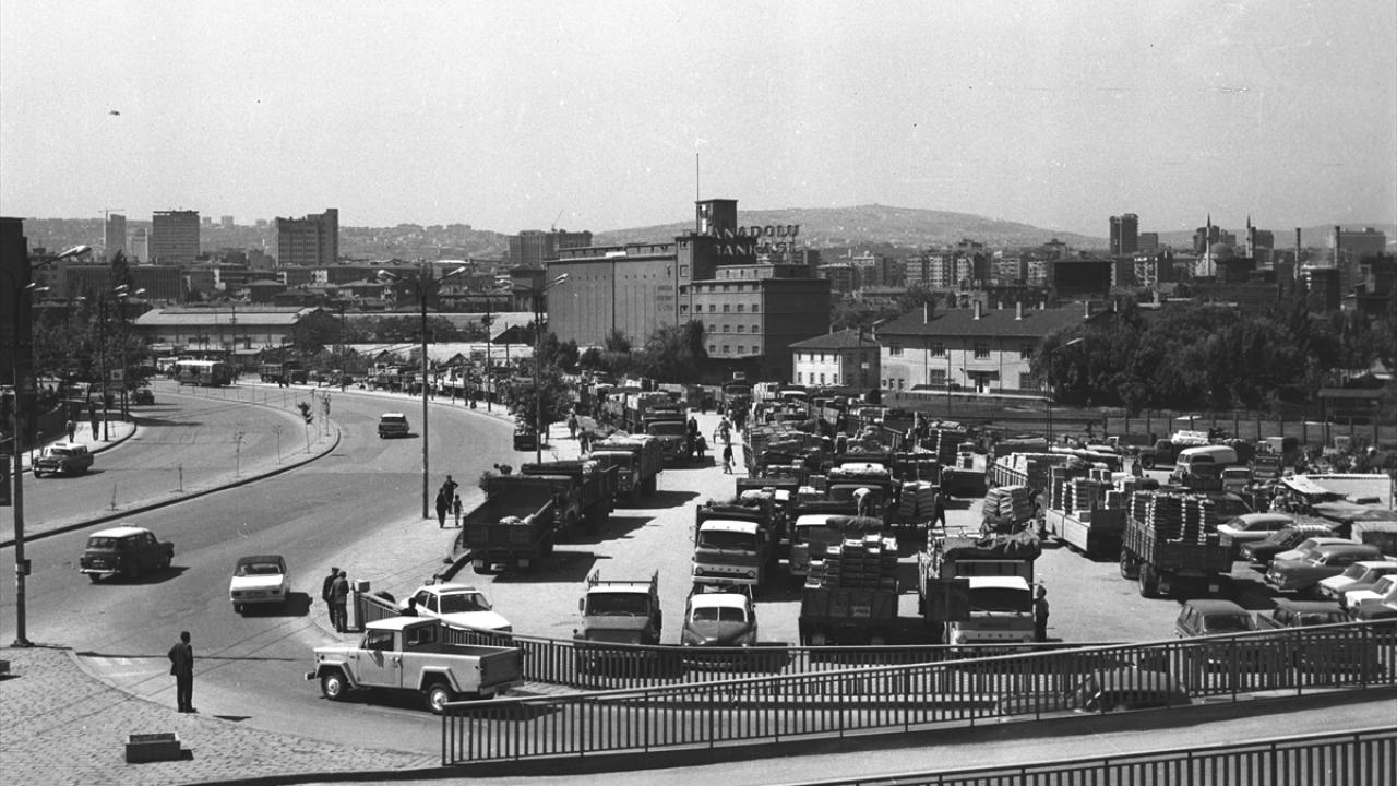 Fotoğrafta 1977 yılında eski Ankara Toptancı Sebze Halinin Opera üst Geçidinden görünümü yer alıyor. (Arşiv)
