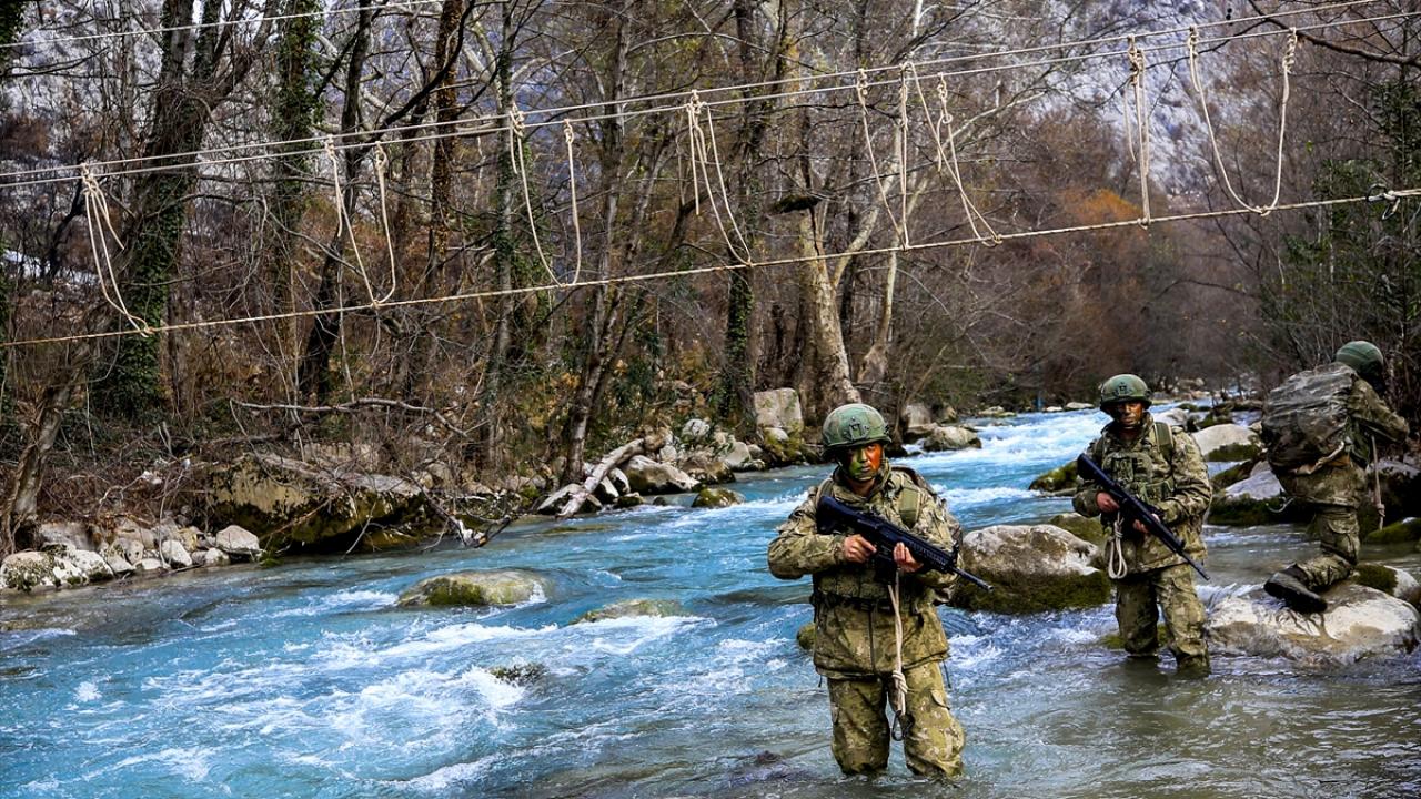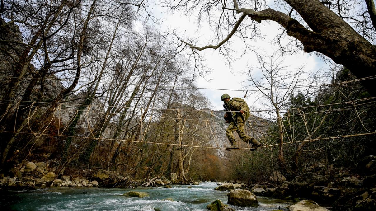 Eğitimlerde Yazılı Kanyon`da iple köprü kurarak su üzerinden geçen komandolar, yaralı askerleri de su üzerinde kurulan ip düzeneğiyle geçirmeyi başardı.