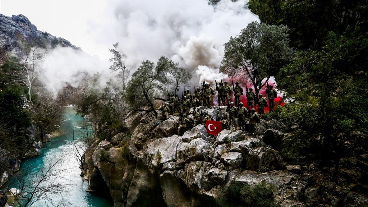 Eğitimlerde komutanlarından tam not alan komandolar, Sütçüler ilçesindeki Yazılı Kanyon`da Türk ordusunun komando andını okudu.