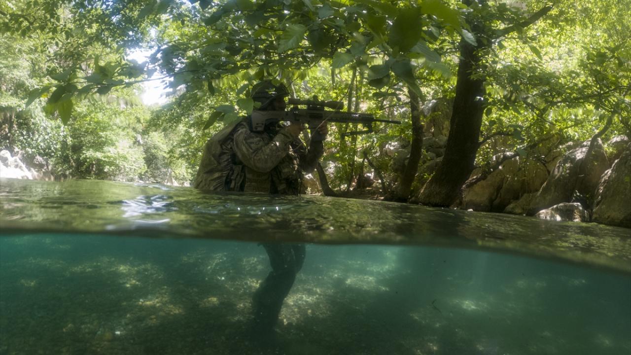 Kanyonun içinde soğuk suda ilerleyen komandolar, ardından 100 metrelik sarp kayalıklara tırmandı. Yine aynı parkurdan inen komandolar, kanyona iple köprü kurarak sudan geçti, yaralı tahliyesi yaptı.