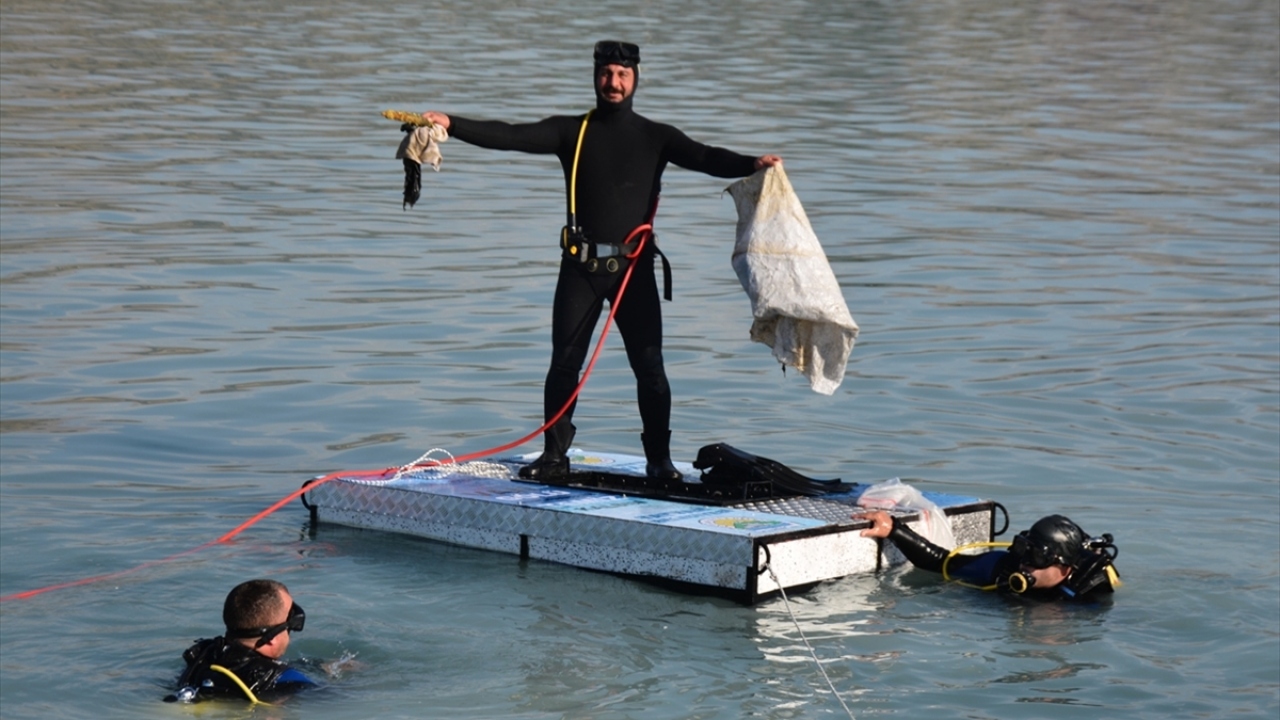 Tatvan sahilinde Van Gölü'ne dalan dalgıçlar, sudan çöp torbaları, ayakkabı, halı, araba lastiği, plastik parçaları, cam şişe gibi atıklar çıkardı.
