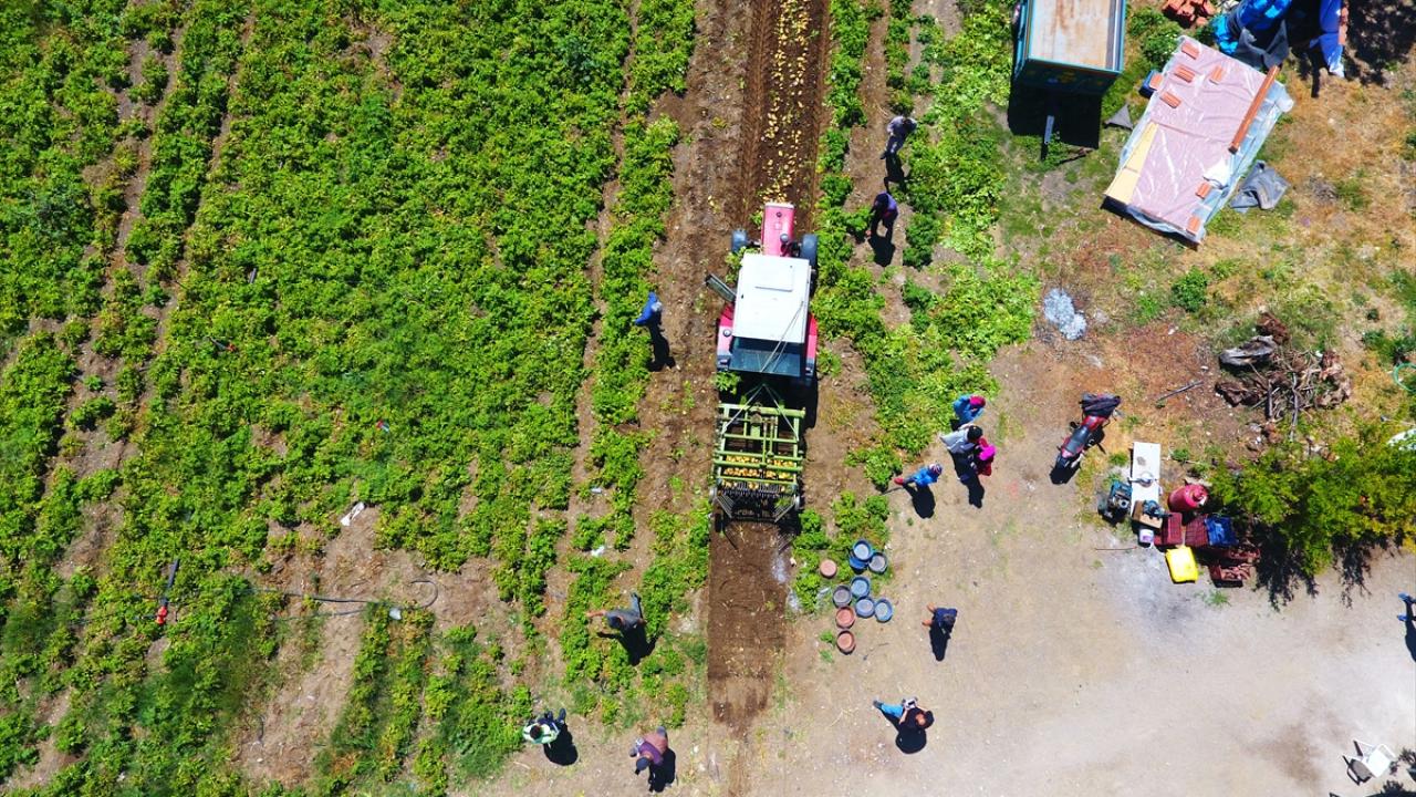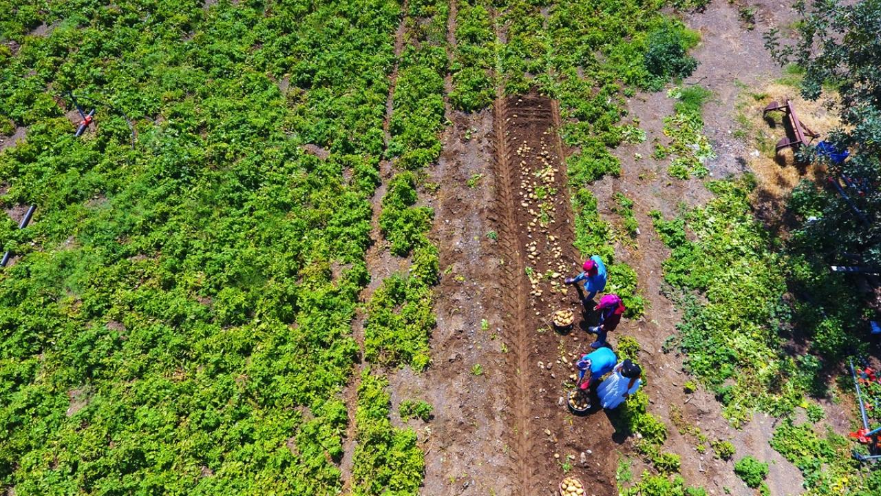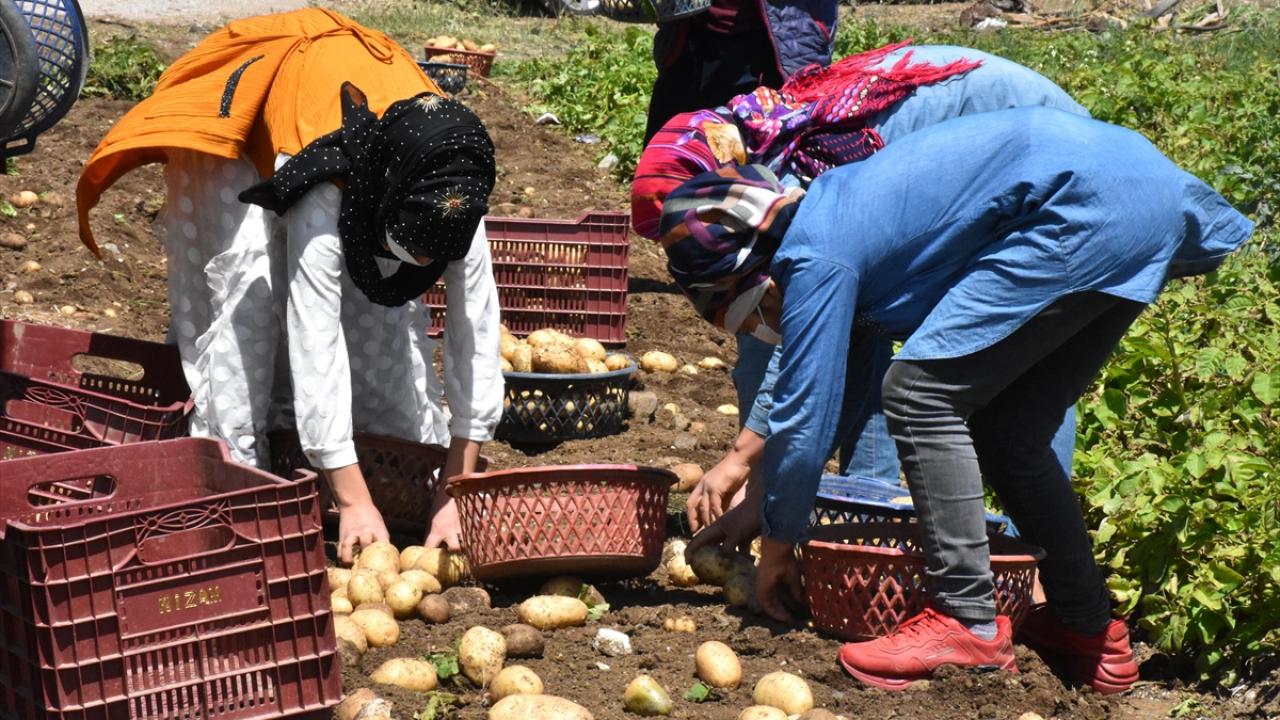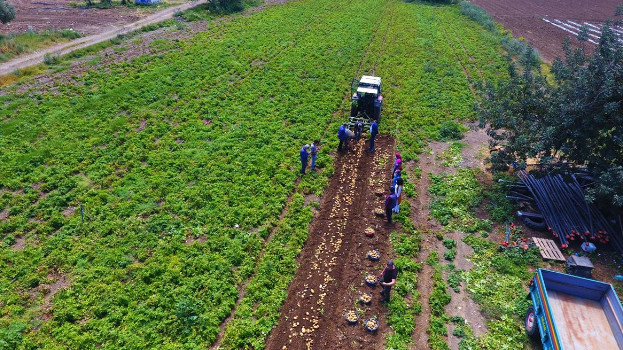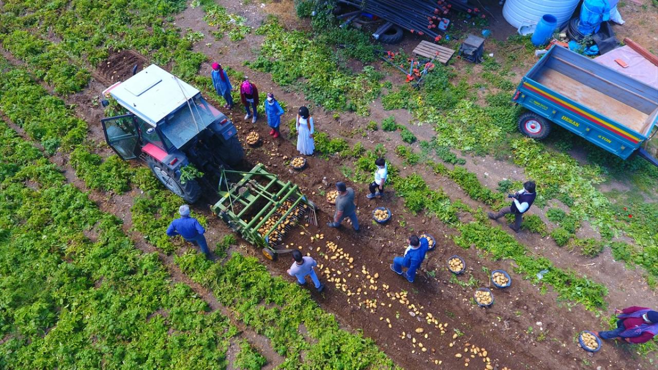 Traktör yardımıyla çıkartılan patatesler, topraktan arındırılıp selelere daha sonra kasalara doldurularak tarlada bekletilen kamyonlara yükleniyor.