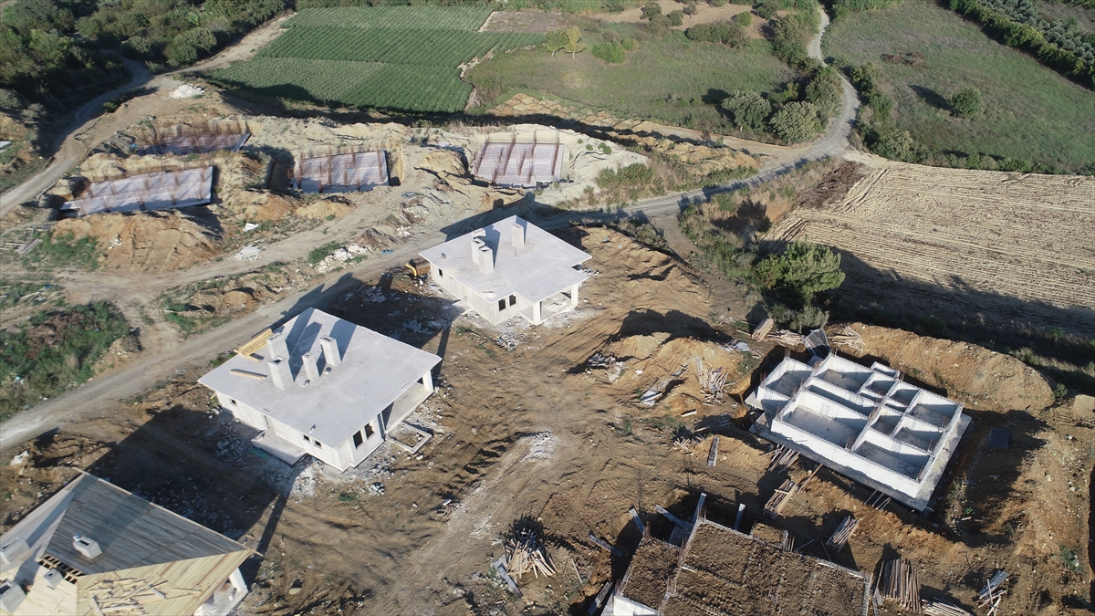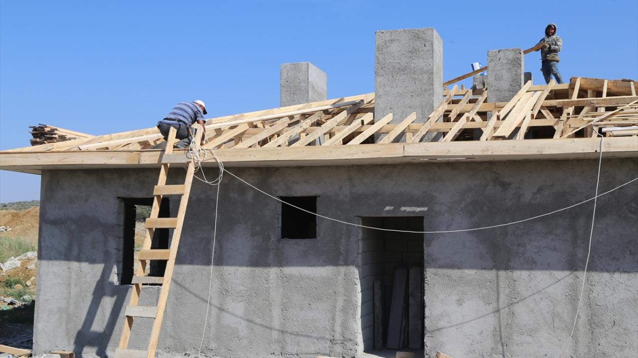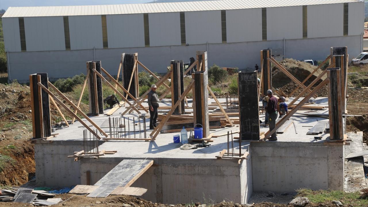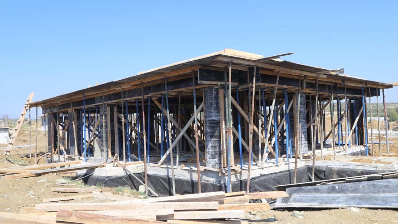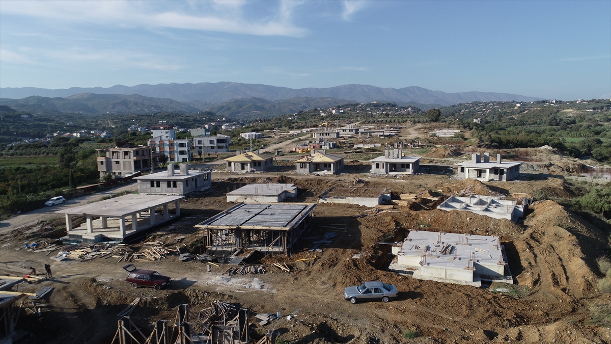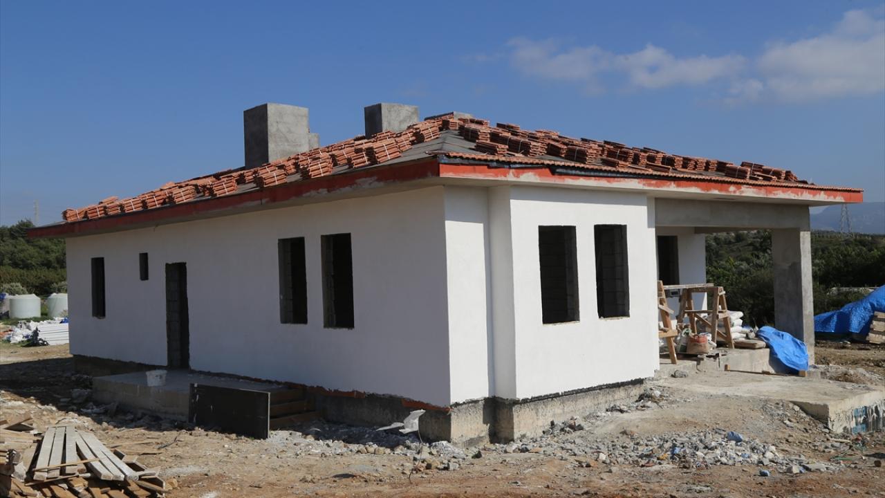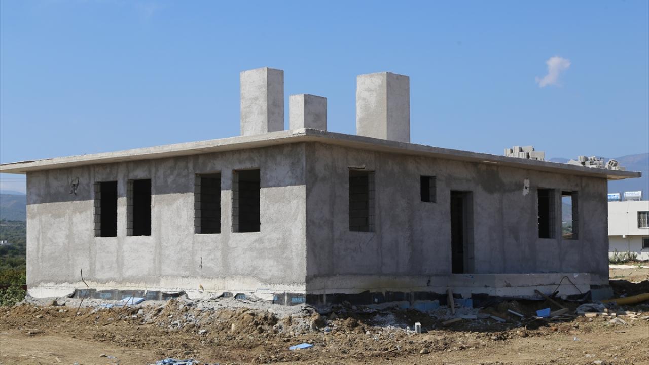 Kahramanmaraş merkezli 6 Şubat'taki depremlerden etkilenen Hatay'ın Defne ilçesinde, evleri yıkılan ya da ağır hasar alan afetzedeler için yapımına başlanan köy tipi evlerin inşası devam ediyor.
